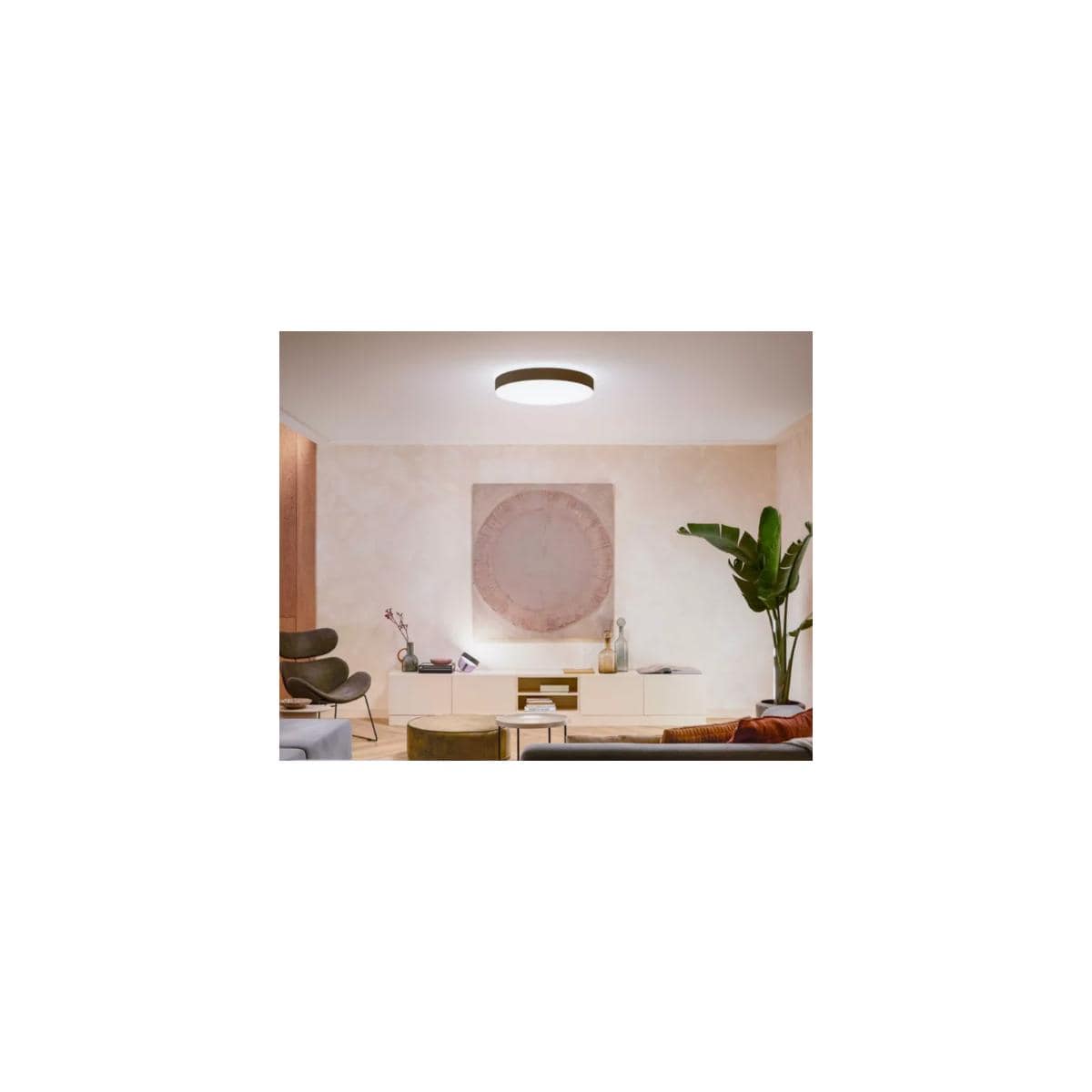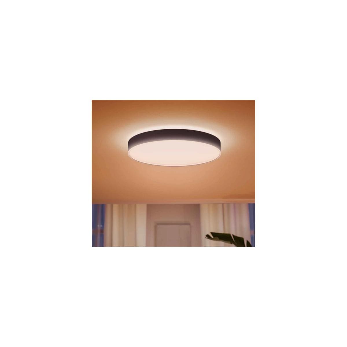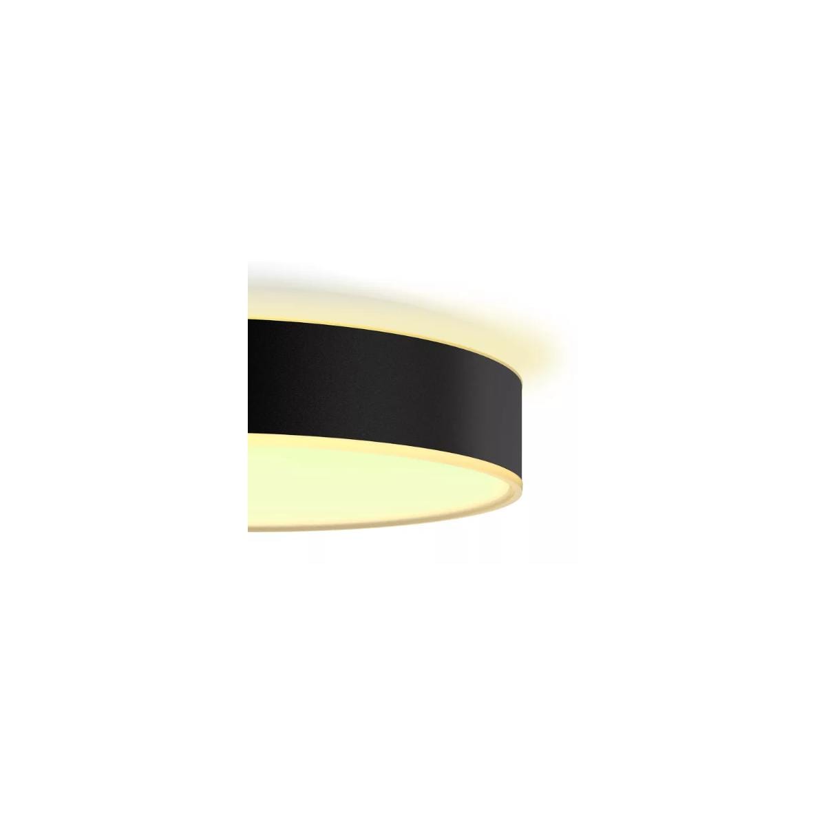 Die extragroße Hue Enrave Deckenleuchte in Schwarz ist leistungsstark genug, um große Räume wie kombinierte Wohn-/Esszimmer zu beleuchten. Das zeitgemäßes Design erzeugt an der Decke ein indirektes und nach unten ein kraftvoll strahlendes Licht.