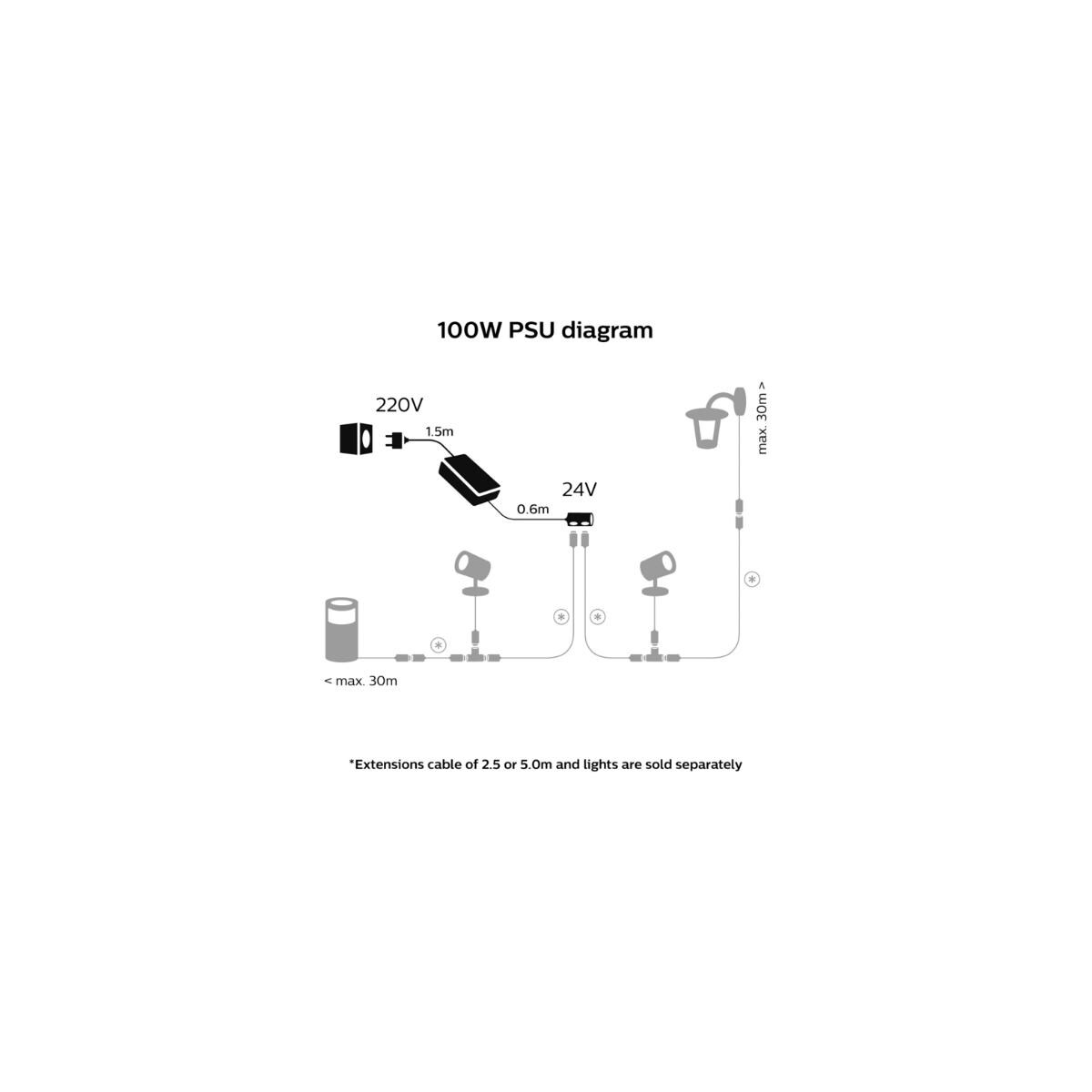Erhelle Deinen gesamten Außenbereich mit intelligentem Licht. Nutze dieses Outdoor Netzteil, mit dem Du verschiedene Leuchten mit bis zu insgesamt 100 Watt anschließen kannst. Schließe an jeden Anschluss jeweils bis zu 30 Meter lange Kabel an jede beliebige Philips Hue-Außenleuchte mit niedriger Spannung an. Addiere die Leistung jeder Leuchte bis der maximale Wert des Netzteils von 100 Watt erreicht ist.