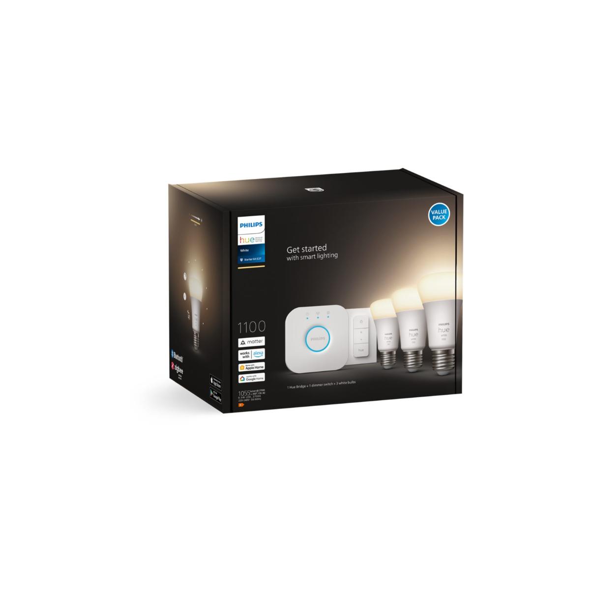 Bringe mit diesem Starter-Set Dein smartes Lichtsystem zum Laufen. Es enthält drei smarte Lampen mit warmweißem Licht, eine Hue Bridge und einen Dimmschalter. Damit besitzt Du ein komplettes Set, um die Beleuchtung in Deinem Zuhause nach eigenen Wünschen zu steuern und alle Funktionen zu nutzen.
