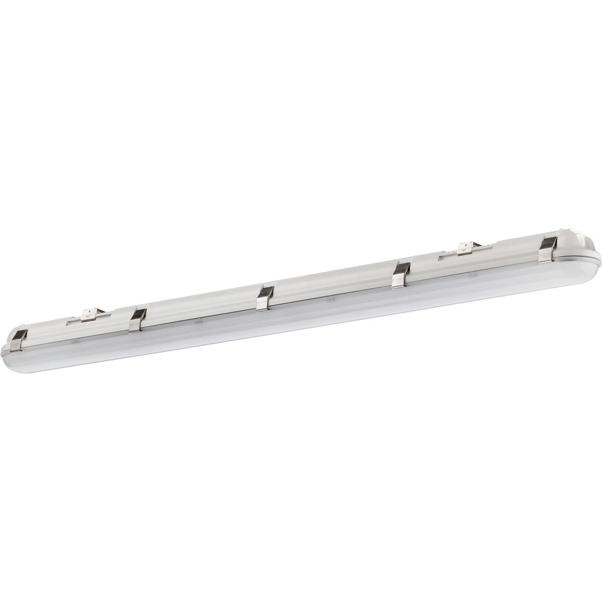Leuchte LUNA BL 1500mm PCO 1x47W 6500lm, SK I, IP65, hoch-effiziente LEDs, breitstrahlend, 4.000K, RA > 80, Ta:-20°C/35°C, Gehäuse aus PC-Polycarbonat und Abdeckung aus PC-OPAL, EAN/GTIN:4018098387121. LED Feuchtraum-Wannenleuchte, BEG-förderfähig, aus weißem Polycarbonat (IK08, schlagfest) mit bewährter Silikonschaumdichtung. LED Träger ist in der Abdeckung integriert. Durchgangsverdrahtung mit optionalem Zubehör möglich. Besonders schneller und komfortabler Montage dank PRACHT-KLAMMERSYSTEM und variablen Befestigungsabständen. Geeignet zur Decken-, waagerechte Wand-, Pendel- und Tragschienenmontage. Optimiert für Parkhäuser, Kellerräume und Werkstätten