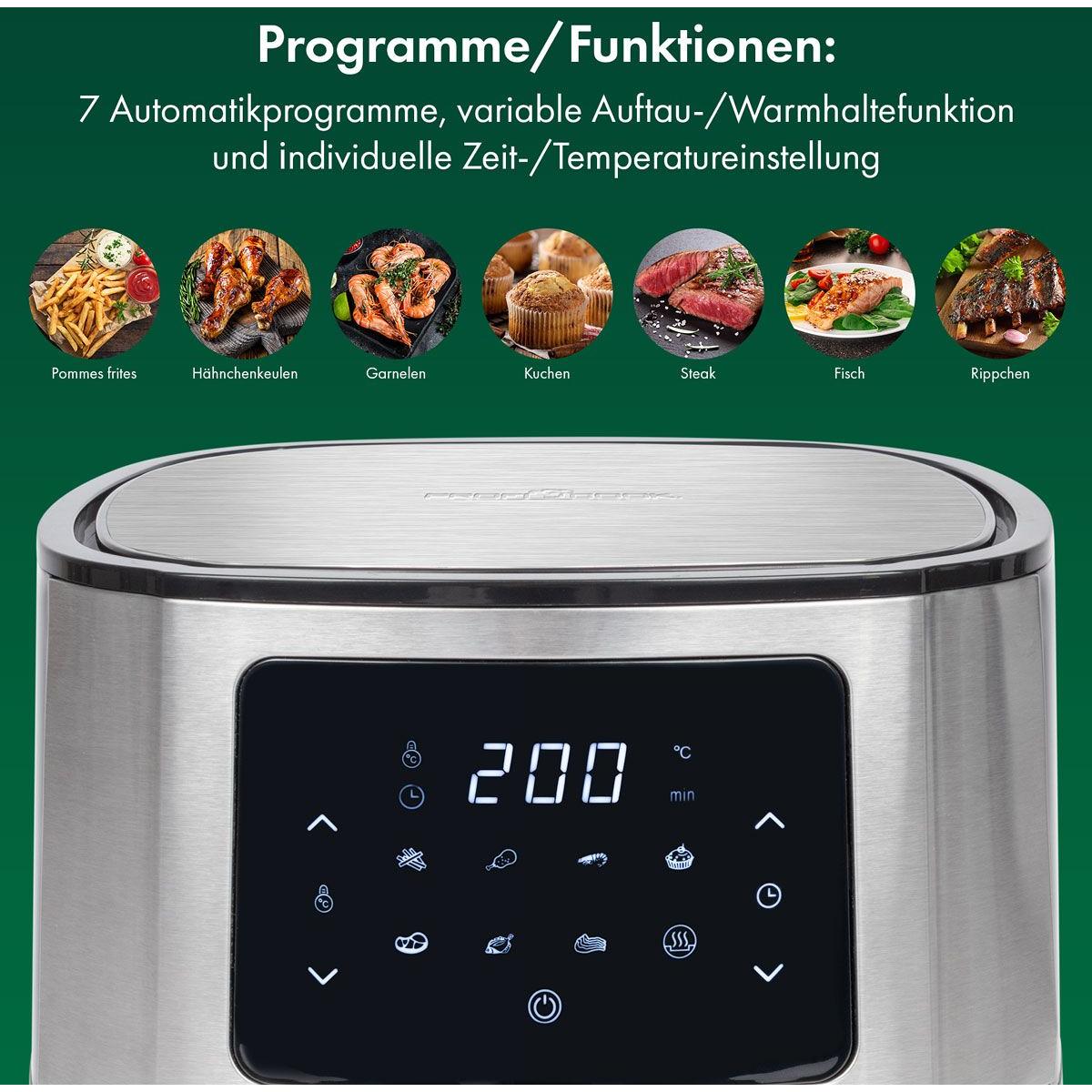- 7 Programme - Das beleuchtete LCD-Display der Heissluftfriteuse wird per Touch bedient. So kann ganz einfach aus einem der 7 voreingestellten Programme ausgewählt werden - das Lieblingsessen ist nur einen Fingertipp weit entfernt