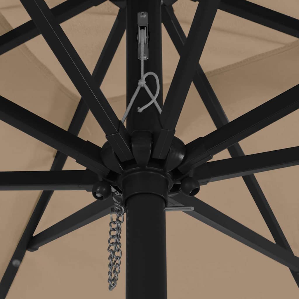 Dieser groe, runde Terrassenschirm ist ein Muss fr deinen Balkon, Garten oder Terrasse. Er bietet tollen Sonnenschutz und bringt Stil in deinen Auenbereich. Die taupe Farbe passt perfekt zu jeder Einrichtung. Dank der verstellbaren Neigung kannst du den Schirmwinkel nach Bedarf anpassen und so den ganzen Tag ber optimalen Schatten genieen. Ideal fr Familienfeiern, Outdoor-Mahlzeiten oder entspannte Lesestunden mit einem guten Buch. Er bietet Platz fr bis zu vier Personen und ist aus robustem, rostfreiem Metall und UV-bestndigem Polyester gefertigt, sodass er smtlichen Wetterbedingungen standhlt und dabei gut aussieht. Bring deine Entspannung im Freien auf die nchste Stufe mit diesem praktischen und eleganten Schirm.