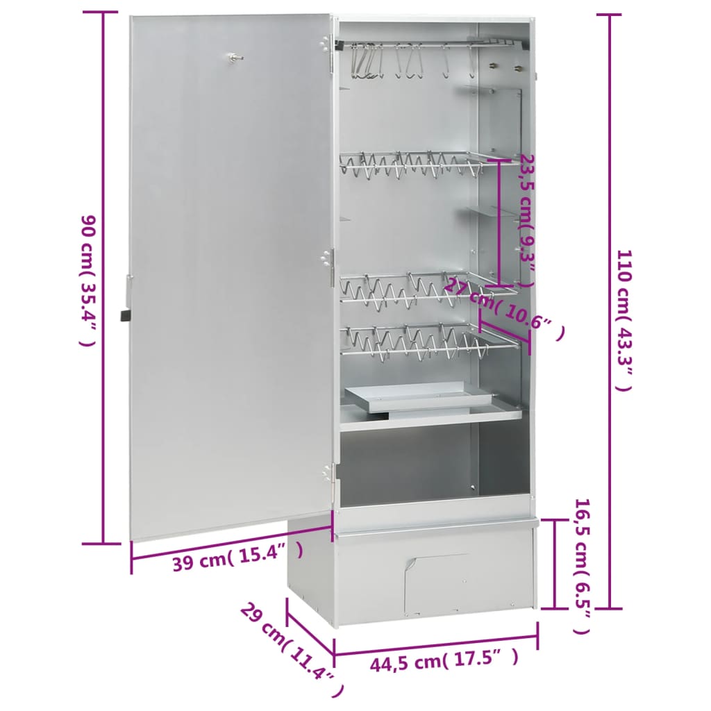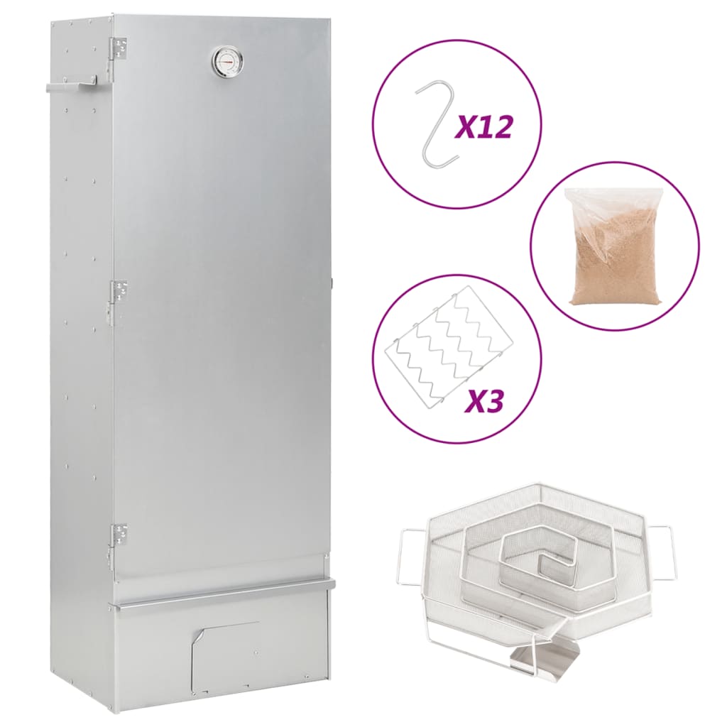 Mit diesem multifunktionalen Räucherofen mit Holzspänen und Kaltrauchgenerator kannst du ein Festmahl zubereiten und eine gemütliche Zeit im Freien mit deiner Familie genießen! Langlebiges Material: Stahl ist ein außergewöhnlich hartes und starkes Material. Er bietet Robustheit und Stabilität. Die Verzinkung bietet einen besseren Schutz gegen Rost und ist für Produkte geeignet, die im Freien verwendet werden.Viel Platz zum Räuchern: Der Outdoor-Smoker bietet viel Platz zum Räuchern von Fleisch, Fisch, Würstchen und mehr. Die mitgelieferten S-förmigen Haken und Roste erleichtern die Zubereitung der Speisen.Mit Thermometer: Der Räucherofen ist mit einem Thermometer ausgestattet, um beste Ergebnisse zu erzielen.Kaltrauchgenerator: Fülle ihn einfach mit Sägemehl und zünde ihn mit einem Teelicht an, bis das Sägemehl anfängt, seine Farbe zu wechseln. Danach kann das Teelicht entfernt und der Kaltraucherzeuger in den Räucherschrank gelegt werden. Dank des sechseckigen, kompakten Gitters brennen die Räucherspäne für bis zu 8 Stunden gleichmäßig und langsam ab. Achtung:Der Grill darf nicht in geschlossenen und/oder bewohnbaren Bereichen wie Häusern, Zelten, Wohnwagen, Wohnmobilen und Booten verwendet werden. Ansonsten besteht die Gefahr einer Kohlenmonoxidvergiftung, die zum Tod führen kann.