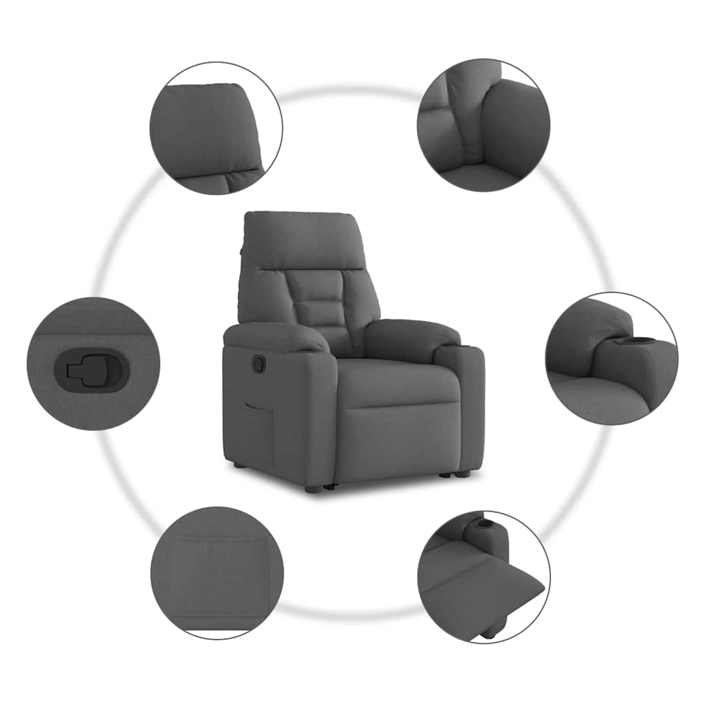 Lehne dich zurück und entspanne dich in diesem äußerst bequemen Relaxsessel mit Aufstehhilfe! Elektrische Aufstehhilfe: Dieser Relaxsessel ist mit einem Elektromotor zum Anheben ausgestattet. Dank der Aufstehhilfe, die den gesamten Sessel nach oben bringt, kannst du ganz einfach auf Knopfdruck aufstehen, ohne deinen Rücken und deine Knie zu belasten.Manuelle Liegefunktion: Dieser Ruhesessel lässt sich mittels des Griffs an der rechten Seite verstellen. So kannst du das Fußteil und die Rückenlehne manuell in jede beliebige Position bringen, um höchsten Komfort zu genießen. Die Rückenlehne lässt sich max. 135 Grad nach hinten verstellen. Durch einfaches Ziehen lässt sie sich schnell wieder in die ursprüngliche Position bringen.Bequemes Sitzerlebnis: Die dick gepolsterte Sitzfläche, die Rückenlehne und die breiten Armlehnen sorgen für ein behagliches und wohliges Sitzgefühl. Der Bezug aus Stoff weist eine schlichte und saubere Optik auf und ist auch atmungsaktiv und langlebig.Praktische Getränkehalter und Seitentasche: Dieser Sessel verfügt über zwei praktische Getränkehalter und eine Seitentasche, in der du deine Fernbedienung oder andere wichtige Sachen griffbereit aufbewahren kannst.Solider und stabiler Rahmen: Der Rahmen aus Holz und Metall sorgt für eine solide Struktur und hohe Stabilität. Dieser TV-Sessel ist bequem und langlebig.