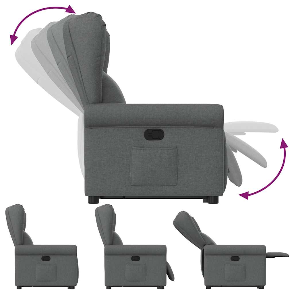 Lehne dich zurück und entspanne dich in diesem äußerst bequemen Relaxsessel mit Aufstehhilfe! Elektrische Aufstehhilfe: Dieser Relaxsessel ist mit einem Elektromotor zum Anheben ausgestattet. Dank der Aufstehhilfe, die den gesamten Sessel nach oben bringt, kannst du ganz einfach auf Knopfdruck aufstehen, ohne deinen Rücken und deine Knie zu belasten.Manuelle Liegefunktion: Dieser Ruhesessel lässt sich mittels des Griffs an der rechten Seite verstellen. So kannst du das Fußteil und die Rückenlehne manuell in jede beliebige Position bringen, um höchsten Komfort zu genießen. Die Rückenlehne lässt sich max. 135 Grad nach hinten verstellen. Durch einfaches Ziehen lässt sie sich schnell wieder in die ursprüngliche Position bringen.Bequemes Sitzerlebnis: Die dick gepolsterte Sitzfläche, die Rückenlehne und die breiten Armlehnen sorgen für ein behagliches und wohliges Sitzgefühl. Der Bezug aus Stoff weist eine schlichte und saubere Optik auf und ist auch atmungsaktiv und langlebig.Praktische Seitentasche: Dieser Sessel verfügt über eine Seitentasche, in der du wichtige Sachen griffbereit aufbewahren kannst.Solider und stabiler Rahmen: Der Rahmen aus Holz und Metall sorgt für eine solide Struktur und hohe Stabilität. Dieser TV-Sessel ist bequem und langlebig.