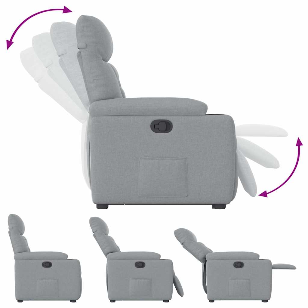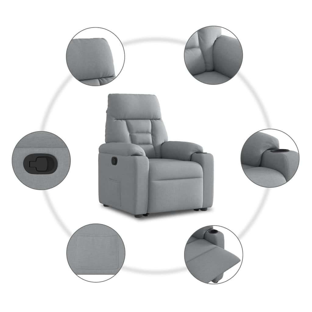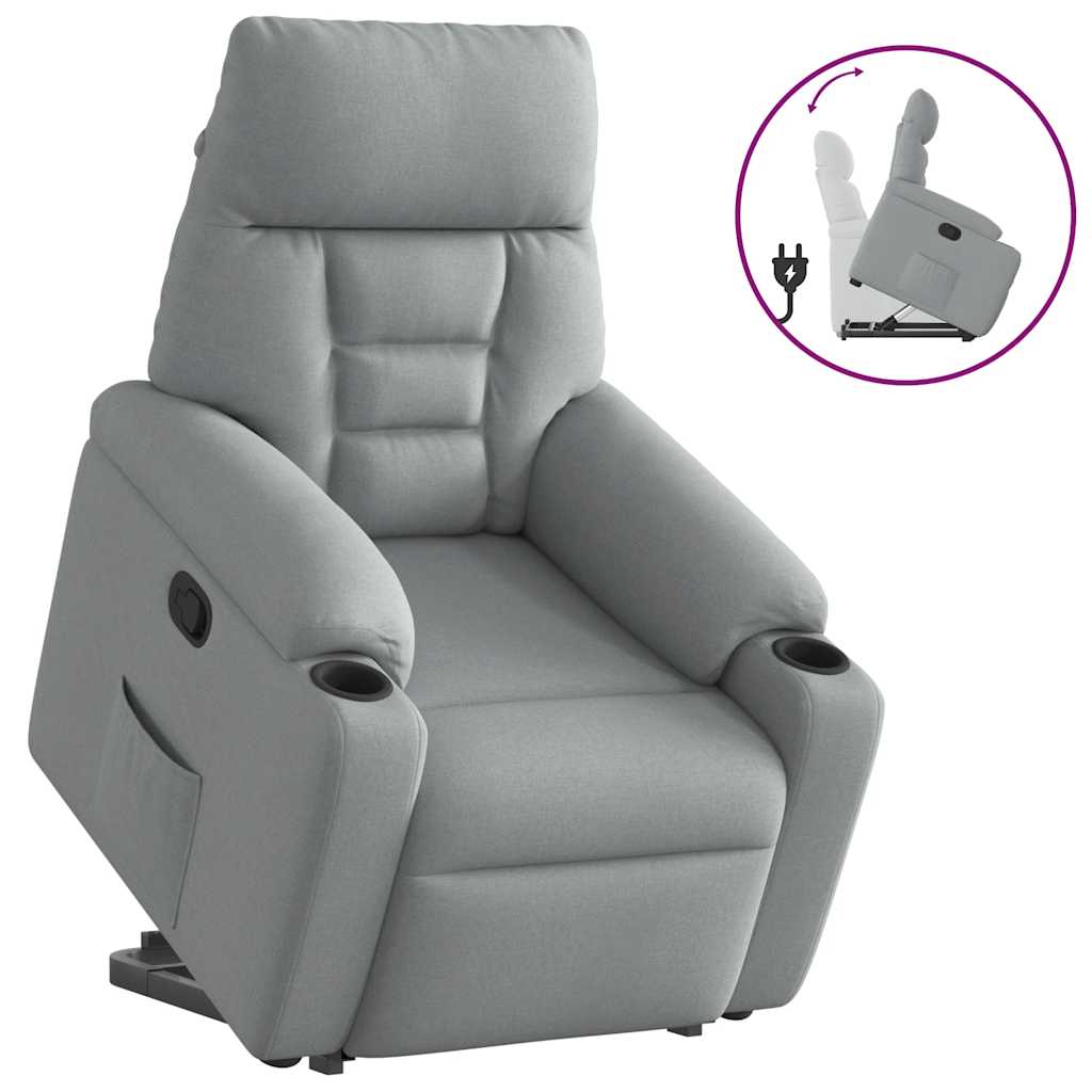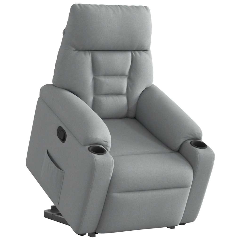 Lehne dich zurück und entspanne dich in diesem äußerst bequemen Relaxsessel mit Aufstehhilfe! Elektrische Aufstehhilfe: Dieser Relaxsessel ist mit einem Elektromotor zum Anheben ausgestattet. Dank der Aufstehhilfe, die den gesamten Sessel nach oben bringt, kannst du ganz einfach auf Knopfdruck aufstehen, ohne deinen Rücken und deine Knie zu belasten.Manuelle Liegefunktion: Dieser Ruhesessel lässt sich mittels des Griffs an der rechten Seite verstellen. So kannst du das Fußteil und die Rückenlehne manuell in jede beliebige Position bringen, um höchsten Komfort zu genießen. Die Rückenlehne lässt sich max. 135 Grad nach hinten verstellen. Durch einfaches Ziehen lässt sie sich schnell wieder in die ursprüngliche Position bringen.Bequemes Sitzerlebnis: Die dick gepolsterte Sitzfläche, die Rückenlehne und die breiten Armlehnen sorgen für ein behagliches und wohliges Sitzgefühl. Der Bezug aus Stoff weist eine schlichte und saubere Optik auf und ist auch atmungsaktiv und langlebig.Praktische Getränkehalter und Seitentasche: Dieser Sessel verfügt über zwei praktische Getränkehalter und eine Seitentasche, in der du deine Fernbedienung oder andere wichtige Sachen griffbereit aufbewahren kannst.Solider und stabiler Rahmen: Der Rahmen aus Holz und Metall sorgt für eine solide Struktur und hohe Stabilität. Dieser TV-Sessel ist bequem und langlebig.