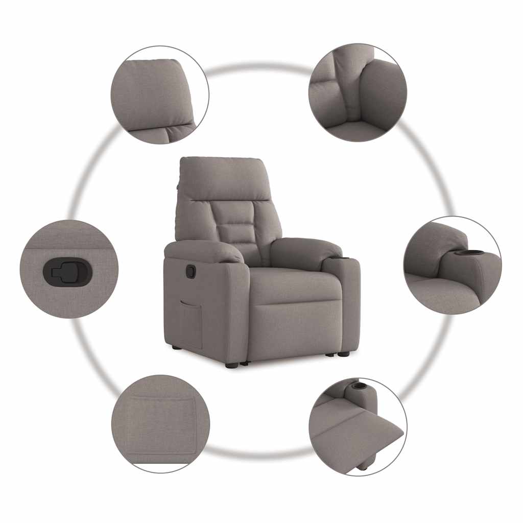 Lehne dich zurück und entspanne dich in diesem äußerst bequemen Relaxsessel mit Aufstehhilfe! Elektrische Aufstehhilfe: Dieser Relaxsessel ist mit einem Elektromotor zum Anheben ausgestattet. Dank der Aufstehhilfe, die den gesamten Sessel nach oben bringt, kannst du ganz einfach auf Knopfdruck aufstehen, ohne deinen Rücken und deine Knie zu belasten.Manuelle Liegefunktion: Dieser Ruhesessel lässt sich mittels des Griffs an der rechten Seite verstellen. So kannst du das Fußteil und die Rückenlehne manuell in jede beliebige Position bringen, um höchsten Komfort zu genießen. Die Rückenlehne lässt sich max. 135 Grad nach hinten verstellen. Durch einfaches Ziehen lässt sie sich schnell wieder in die ursprüngliche Position bringen.Bequemes Sitzerlebnis: Die dick gepolsterte Sitzfläche, die Rückenlehne und die breiten Armlehnen sorgen für ein behagliches und wohliges Sitzgefühl. Der Bezug aus Stoff weist eine schlichte und saubere Optik auf und ist auch atmungsaktiv und langlebig.Praktische Getränkehalter und Seitentasche: Dieser Sessel verfügt über zwei praktische Getränkehalter und eine Seitentasche, in der du deine Fernbedienung oder andere wichtige Sachen griffbereit aufbewahren kannst.Solider und stabiler Rahmen: Der Rahmen aus Holz und Metall sorgt für eine solide Struktur und hohe Stabilität. Dieser TV-Sessel ist bequem und langlebig.