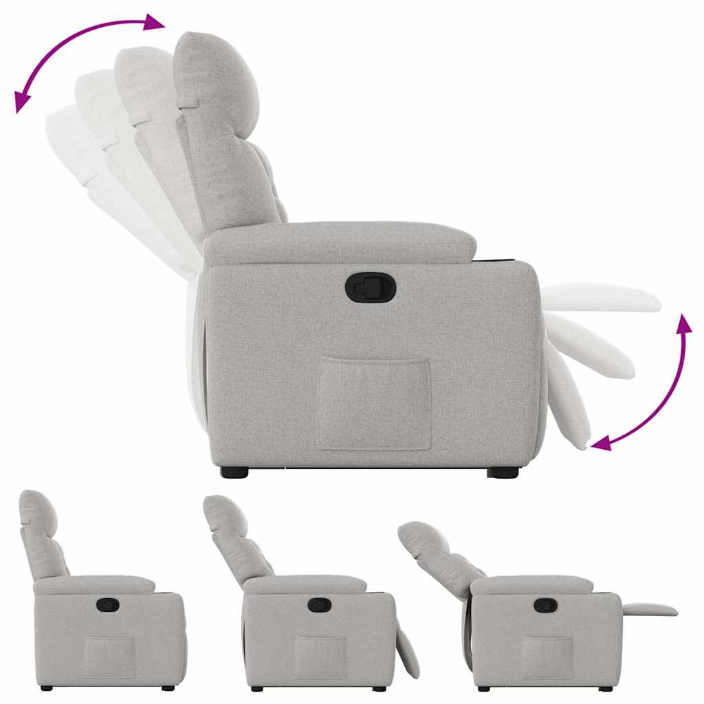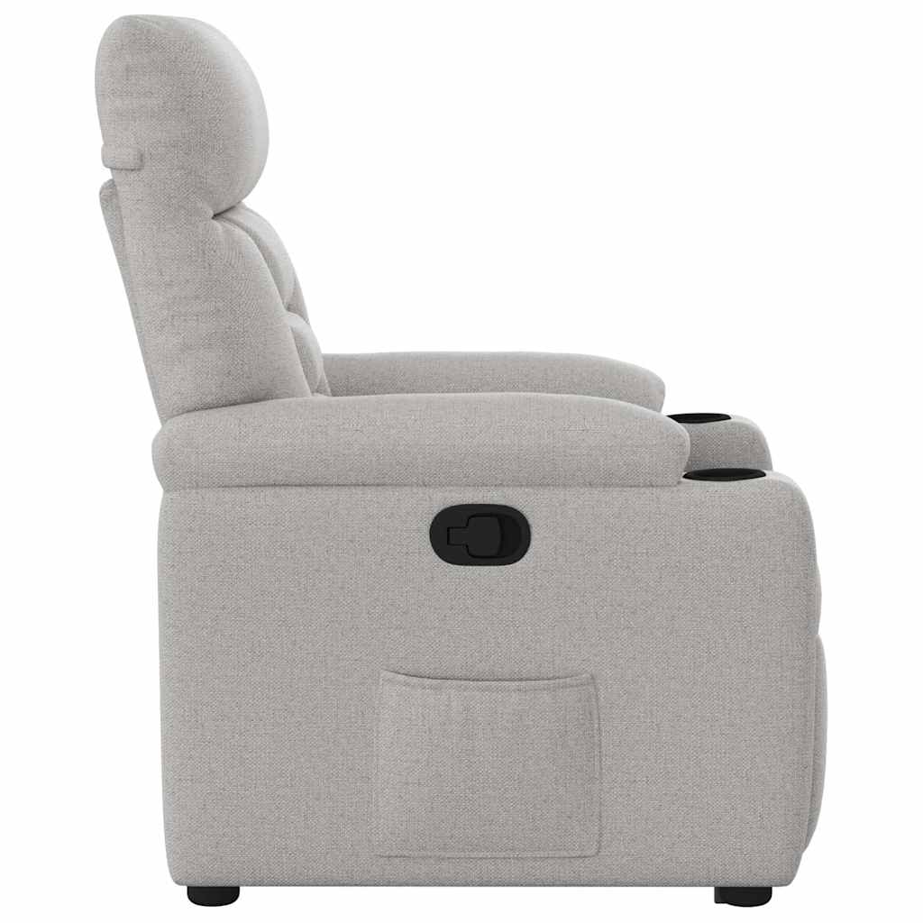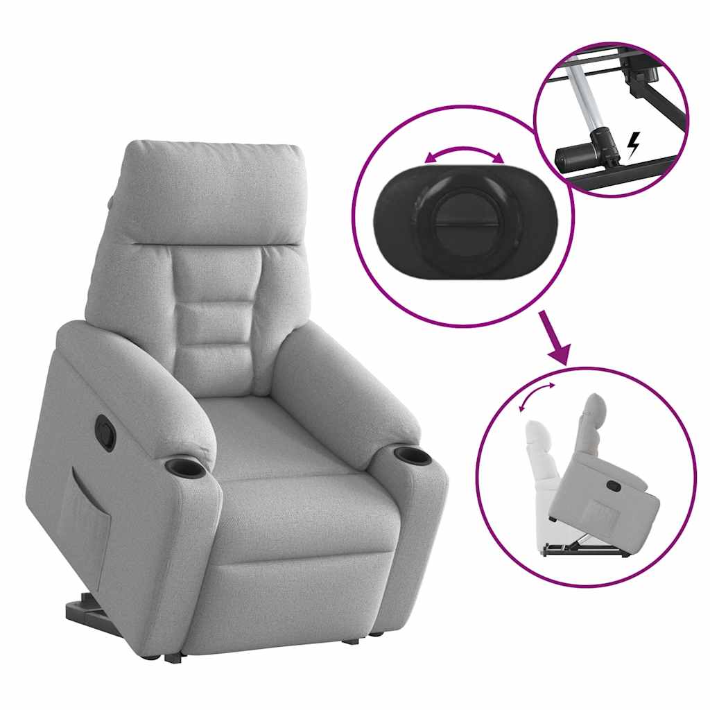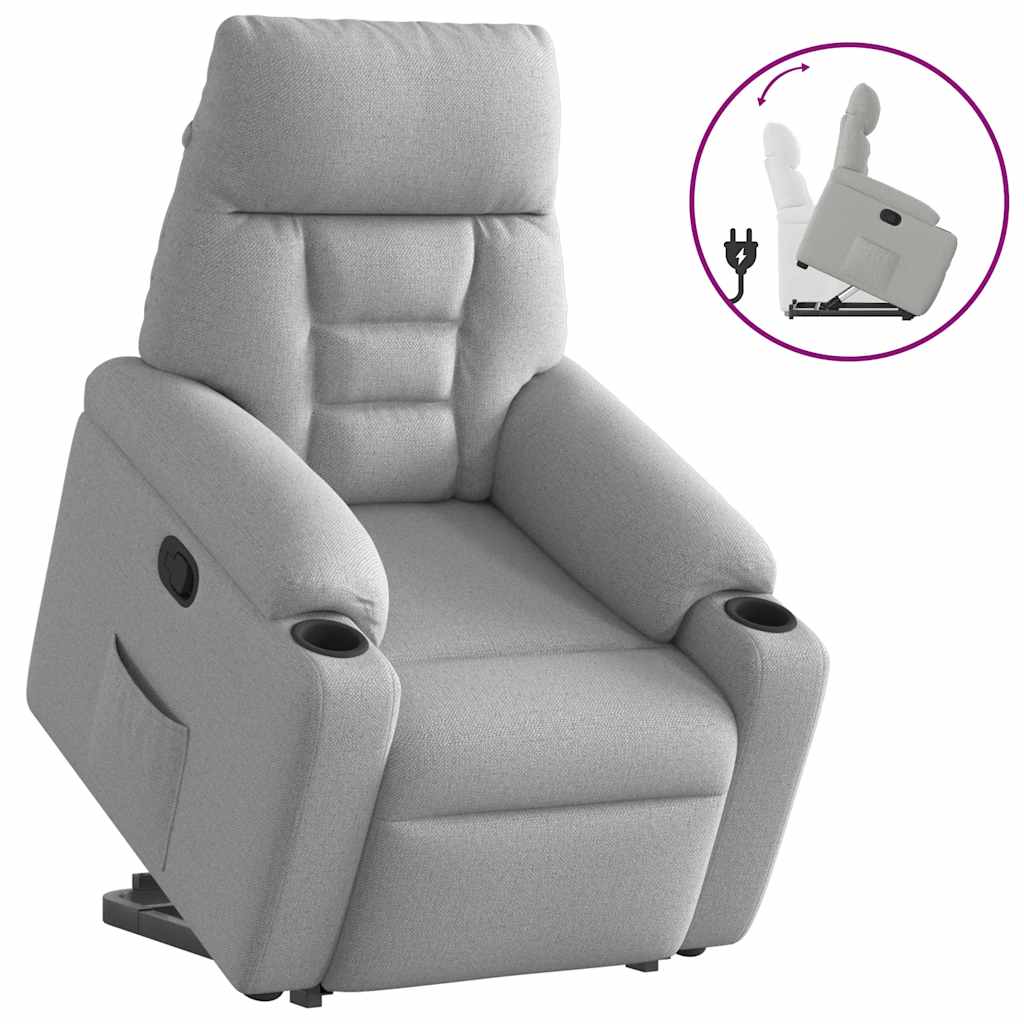 Lehne dich zurück und entspanne dich in diesem äußerst bequemen Relaxsessel mit Aufstehhilfe! Elektrische Aufstehhilfe: Dieser Relaxsessel ist mit einem Elektromotor zum Anheben ausgestattet. Dank der Aufstehhilfe, die den gesamten Sessel nach oben bringt, kannst du ganz einfach auf Knopfdruck aufstehen, ohne deinen Rücken und deine Knie zu belasten.Manuelle Liegefunktion: Dieser Ruhesessel lässt sich mittels des Griffs an der rechten Seite verstellen. So kannst du das Fußteil und die Rückenlehne manuell in jede beliebige Position bringen, um höchsten Komfort zu genießen. Die Rückenlehne lässt sich max. 135 Grad nach hinten verstellen. Durch einfaches Ziehen lässt sie sich schnell wieder in die ursprüngliche Position bringen.Bequemes Sitzerlebnis: Die dick gepolsterte Sitzfläche, die Rückenlehne und die breiten Armlehnen sorgen für ein behagliches und wohliges Sitzgefühl. Der Bezug aus Stoff weist eine schlichte und saubere Optik auf und ist auch atmungsaktiv und langlebig.Praktische Getränkehalter und Seitentasche: Dieser Sessel verfügt über zwei praktische Getränkehalter und eine Seitentasche, in der du deine Fernbedienung oder andere wichtige Sachen griffbereit aufbewahren kannst.Solider und stabiler Rahmen: Der Rahmen aus Holz und Metall sorgt für eine solide Struktur und hohe Stabilität. Dieser TV-Sessel ist bequem und langlebig.