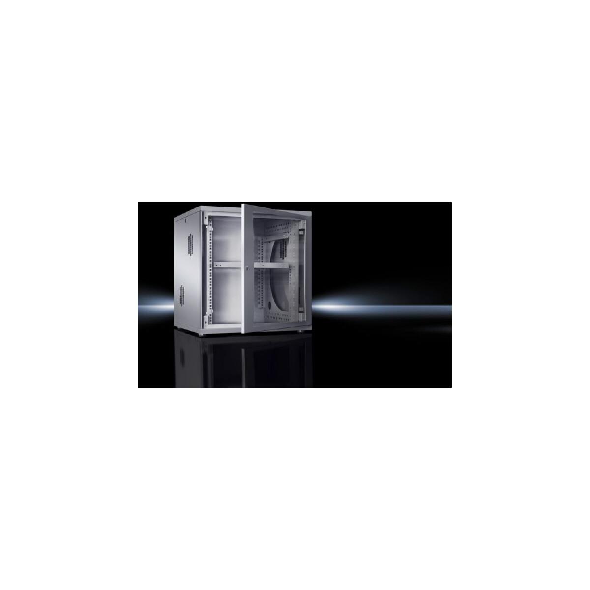 15 HE Wand-/Standgehäuse mit im 25 mm Raster tiefenverstellbarem 482,6 mm (19")-Montagerahmen vorne, bestehend aus Wandteil, zwei Grundträgern, Dach- und Bodenblech, jeweils mit Ausbruch zur Kabeleinführung, abgedeckt mit Bürstenleisten, zwei 482,6 mm (19")-Profilschienen, zwei abschließbaren Seitenwänden und einer abschließbaren Sichttür. Das Gehäuse wird mit Snap-Verbindungselementen werkzeuglos aufgebaut. Durch die symmetrische Grundkonstruktion ist ein verwechslungsfreier Aufbau möglich. Türanschlag frei wähl-bar. Statische Belastbarkeit der 482,6 mm (19")-Ebene: 5 kg/HE. Seitenwände, Dach und Bodenrahmen mit jeweils zwei Lüfterfeldern für eine passive Durchlüftung, eine Erweiterung zur aktiven Klimatisierung ist mit separat erhältlichen Lüftermotoren möglich, nicht benötigte Lüfterfelder können mit separat erhältlichen Abdeckplatten geschlossen werden. Der Einsatz als Standgehäuse ist mit beiliegenden Nivellierfüßen möglich. Zusätzliche hintere 482,6 mm (19")-Befestigungsebene mit separat erhältlichem Profil-schienensatz möglich.