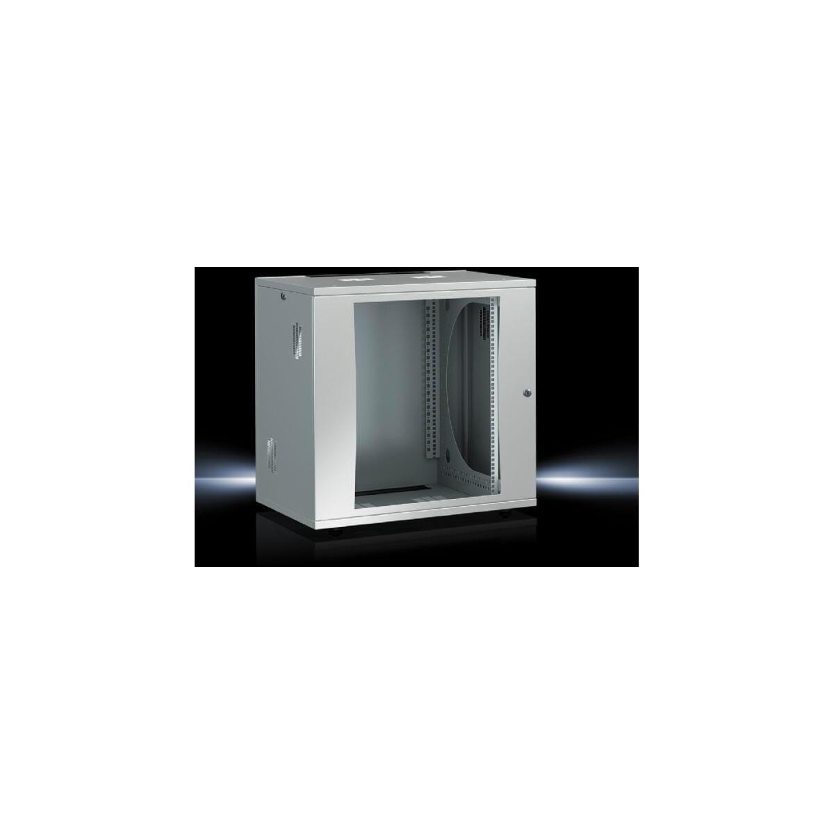 12 HE Wand-/Standgehäuse mit im 25 mm Raster tiefenverstellbarem 482,6 mm (19")-Montagerahmen vorne, bestehend aus Wandteil, zwei Grundträgern, Dach- und Bodenblech, jeweils mit Ausbruch zur Kabeleinführung, abgedeckt mit Bürstenleisten, zwei 482,6 mm (19")-Profilschienen, zwei abschließbaren Seitenwänden und einer abschließbaren Sichttür. Das Gehäuse wird mit Snap-Verbindungselementen werkzeuglos aufgebaut. Durch die symmetrische Grundkonstruktion ist ein verwechslungsfreier Aufbau möglich. Türanschlag frei wählbar. Statische Belastbarkeit der 482,6 m (19")-Ebene: 5 kg/HE. Seitenwände, Dach und Bodenrahmen mit jeweils zwei Lüfterfeldern für eine passive Durchlüftung, eine Erweiterung zur aktiven Klimatisierung ist mit separat erhältlichen Lüftermotoren möglich, nicht benötigte Lüfterfelder können mit separat erhältlichen Abdeckplatten geschlossen werden. Der Einsatz als Standgehäuse ist mit separat erhältlichen Nivellierfüßen möglich. Zusätzliche hintere 482,6 mm (19")-Befestigungsebene mit separat erhältlichem Profilschienensatz möglich.