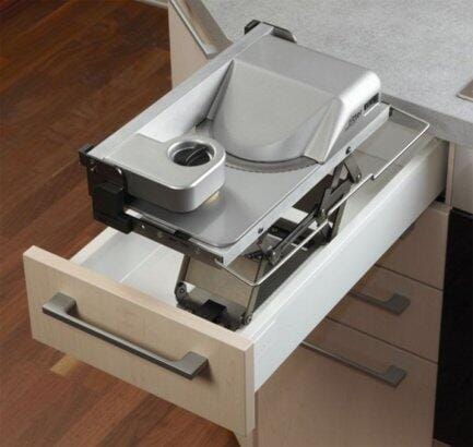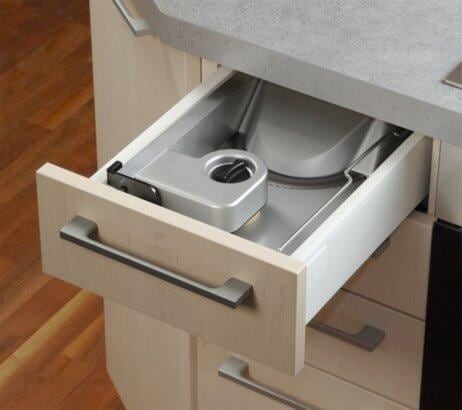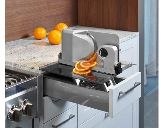 Die Schneidemaschine AES 52 S braucht extrem wenig Platz und das Gerät kann ohne Werkzeug zur problemlosen Reinigung aus der Schublade ausgebaut werden.