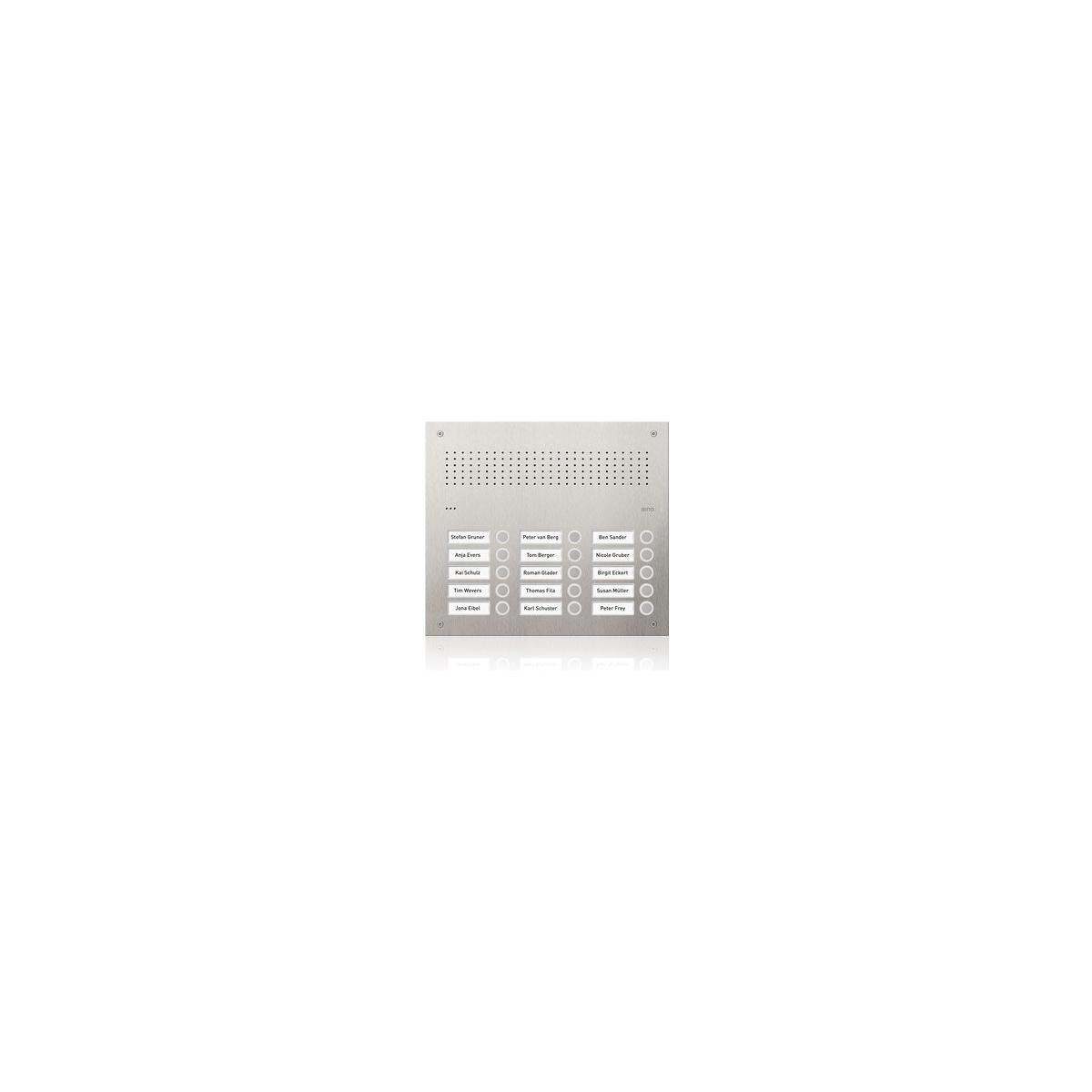 Acero PUR Edelstahl-Türstation mit vorinstalliertem Einbaulautsprecher. Vandalismusgeschützte Türstation. Frontplatte 2,5 mm Edelstahl geschliffen. Bündig abschließende Taster und Namensschilder. Beleuchtete Namensschilder und Klingeltasten mit weißen LEDs. Große Namensschilder 16x64 mm von vorne ohne Spezialwerkzeug austauschbar. Einfache Montage Frontplatte mit Fangseil, UP-Kasten mit Mauerankern, flexible Kabeleinführung. UP-Kasten nur 40 bzw. 52 mm tief - die bestehende Wärmedämmung bleibt erhalten. Farbe Edelstahl.