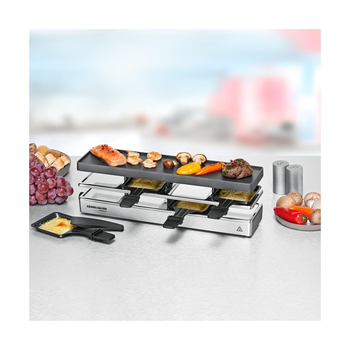 Rommelsbacher RC 800 Raclette, 730W, Grillfläche 41 x 10 cm, Antihaftbeschichtung , 4 Pfännchen, 4 Schaber, stufenlose Temperaturregelung, silber