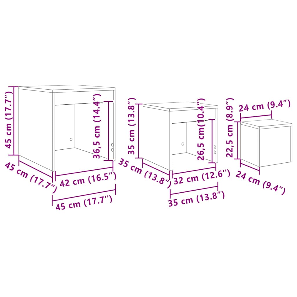 Diese Satztische bieten eine perfekte Alternative für kleine Wohnungen oder überall dort, wo der Platz etwas begrenzt ist. Durch ihr modernes Design sind sie eine schicke Ergänzung zu Ihrem Wohn- oder Schlafzimmer. Satztische: Dank der unterschiedlichen Größen werden diese Beistelltische nicht nur unterschiedlichen Anforderungen gerecht, sondern bieten auch zusätzlichen Platz und lassen sich einfach verstauen, da die kleineren Tische Platz unter dem größeren Tisch finden.Multifunktional: Sie lassen sich im Wohnzimmer einsetzen, um Platz für Getränke und andere Notwendigkeiten zu bieten, die Sie griffbereit haben möchten. Sie können aber auch einen Tisch in Ihr Schlafzimmer bringen und als einzigartigen Nachttisch verwenden!Pflegeleichtes Material: Holzwerkstoff ist mit seiner glatten Oberfläche ein Material hoher Qualität, das sich durch Festigkeit, Stabilität und Feuchtigkeitsbeständigkeit auszeichnet. Aus Holzwerkstoff gefertigt, lassen sich diese Satztische ganz einfach reinigen.