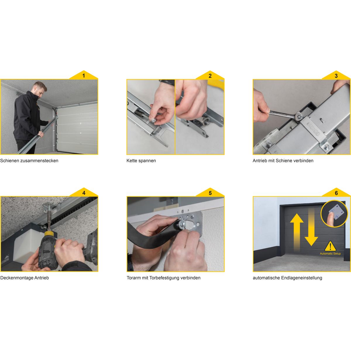 Die einfache Ein-Personen-Montage sowie die automatische Endlageneinstellung ermöglichen, dass der Garagentorantrieb in kurzer Zeit einsatzfähig ist. Die 4-teilige Führungsschiene des DRIVE Actions wird an der Decke befestigt und besteht aus verzinktem, verwindungssteifem Stahl. Weiterhin wird der in der Führungsschiene befindliche Gleitschlitten mit dem Torarm, dem am Tor befestigten Winkel und der Antriebskette verbunden. Wird der Garagentorantrieb in Betrieb genommen, stellt sich der Motor auf das bestehende Garagentor ein und passt die Krafteinstellung bei jeder Fahrt automatisch an. Bei Erreichen der eingestellten Endpunkte schaltet sich der Motor durch eine elektronische Wegerfassung punktgenau ab.