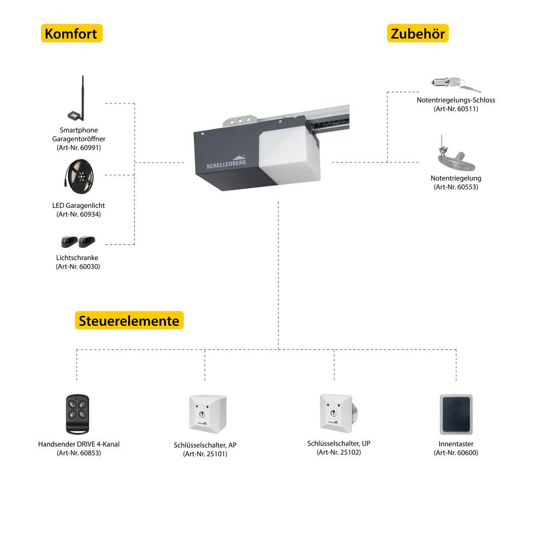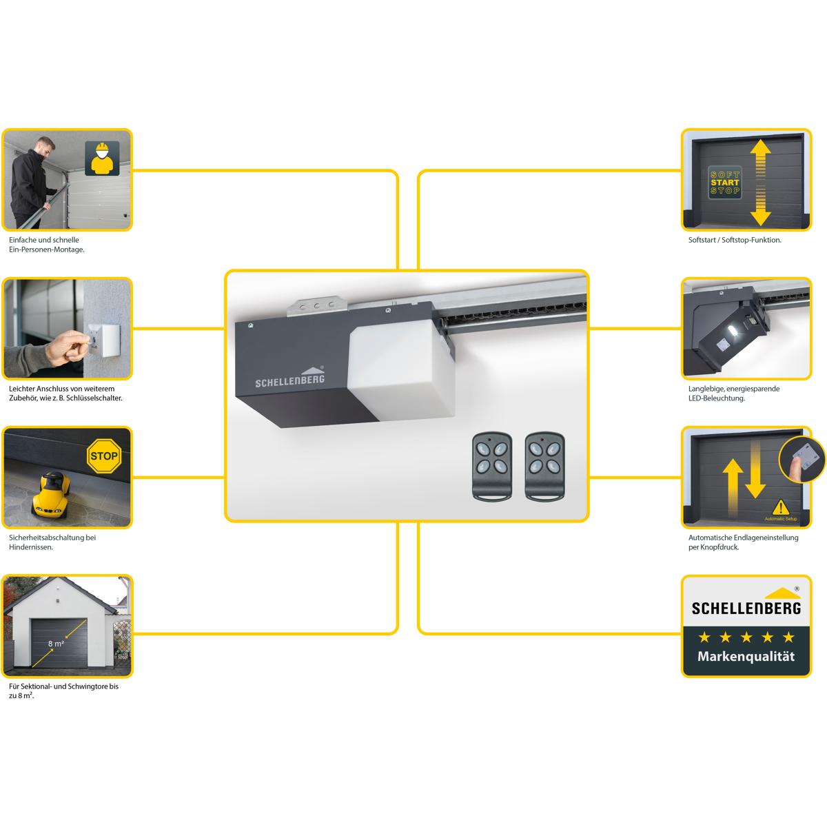 Bei der Entwicklung aller Garagentorantriebe von Schellenberg wird viel Wert auf die Sicherheit gelegt. Deshalb verfügen alle Garagentorantriebsmodelle über eine automatische Hinderniserkennung, einen Überhitzungsschutz des Motors, eine Notentriegelung für innen sowie eine sichere Funkübertragung. Der Funk wird mit 433,92 MHz gesendet und ist mit einem sogenannten Rollingcode gesichert. Dadurch wird das Abfangen des Funksignals durch Unbefugte erschwert. Bei einem Stromausfall bleibt die Programmierung des DRIVE Actions erhalten.