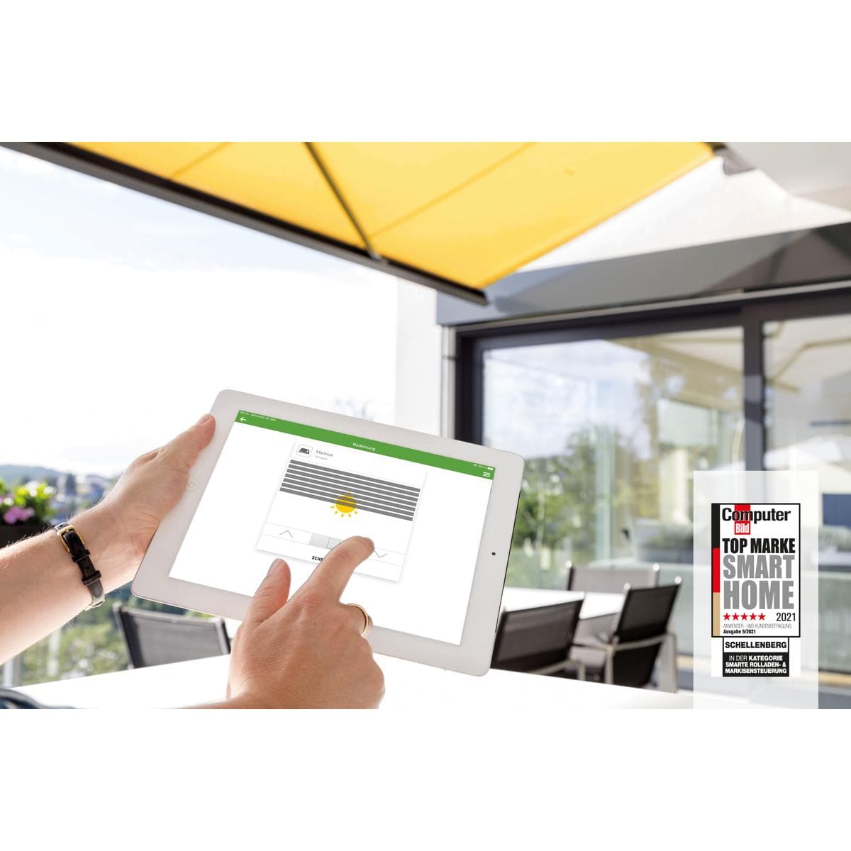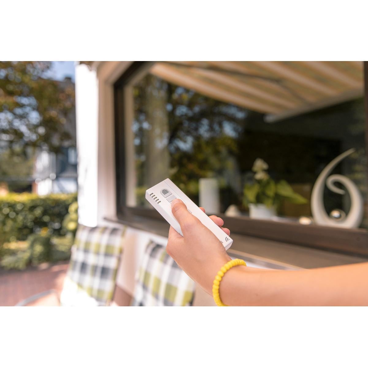 - Funk-Sender - Fernsteuerung: Verwenden Sie für die Fernsteuerung entweder einen Schellenberg Funk-Handsender oder eine Schellenberg Funk-Zeitschaltuhr. Mit der Zeitschaltuhr können Sie die Markise zusätzlich zu individuellen Uhrzeiten automatisch ein- oder ausfahren lassen.