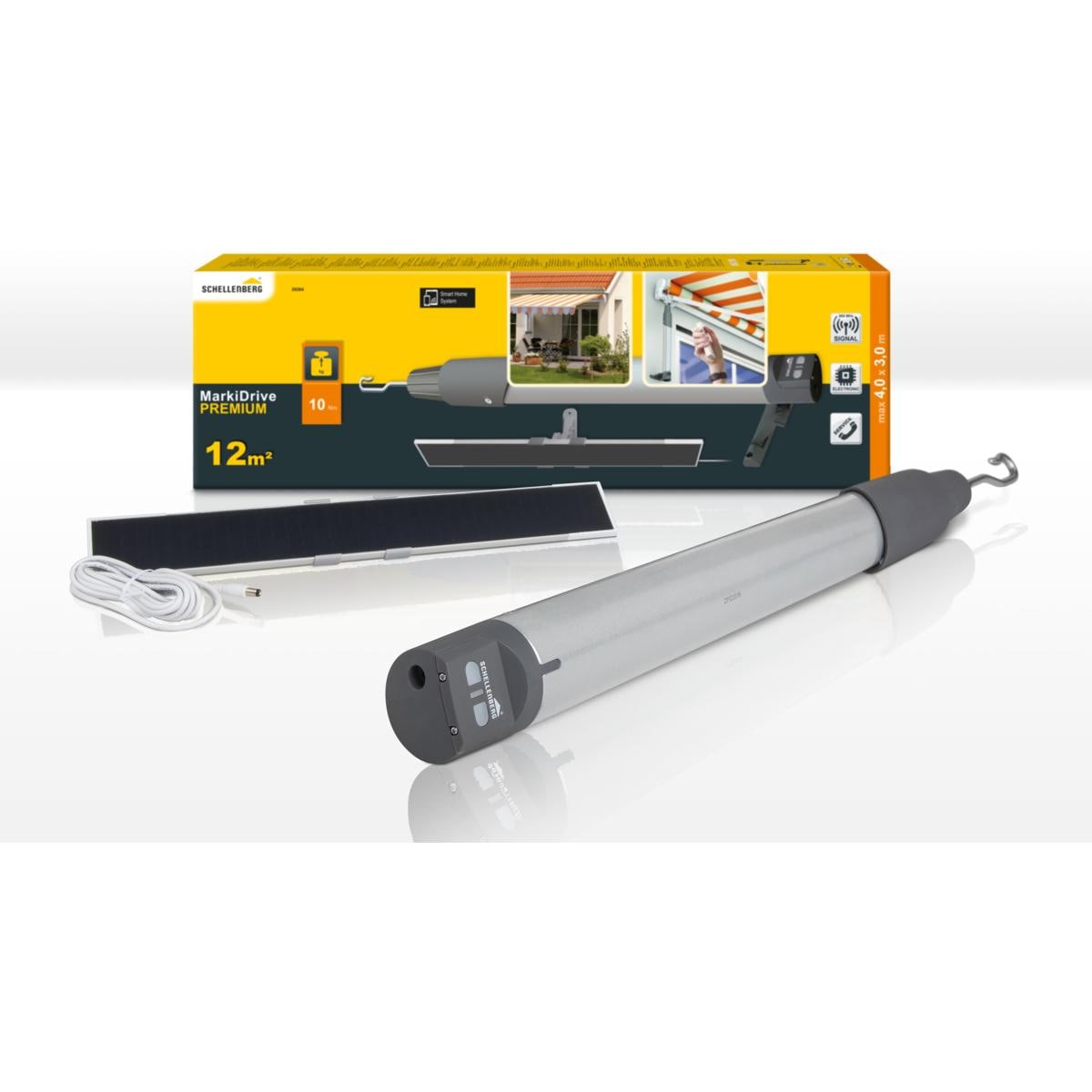 Der Schellenberg Markisenantrieb Premium ist für zweiarmige Markisen mit Kurbelgetriebe und einer maximalen Fläche von 12 m² bzw. 4,0 m x 3,0 m geeignet. Ideal ist ein bereits vorhandenes Kurbeluntersetzungsgetriebe, um das Ein- und Ausfahren der Markise zu unterstützen. Sollte der Markisenantrieb überhitzen, schaltet er dank des Überlastungsschutzes automatisch ab. Während der kalten Jahreszeit empfiehlt es sich, den Akku in den Winterschlaf-Modus zu versetzen, um ihn zu schonen und die Lebenszeit zu verlängern. Falls Ihre Markise schwer erreichbar ist oder zu hoch hängt, um den Antrieb komfortabel zu bedienen, dann können Sie den Haken mit der separat erhältlichen Schellenberg Hakenverlängerung um 50 cm erweitern.