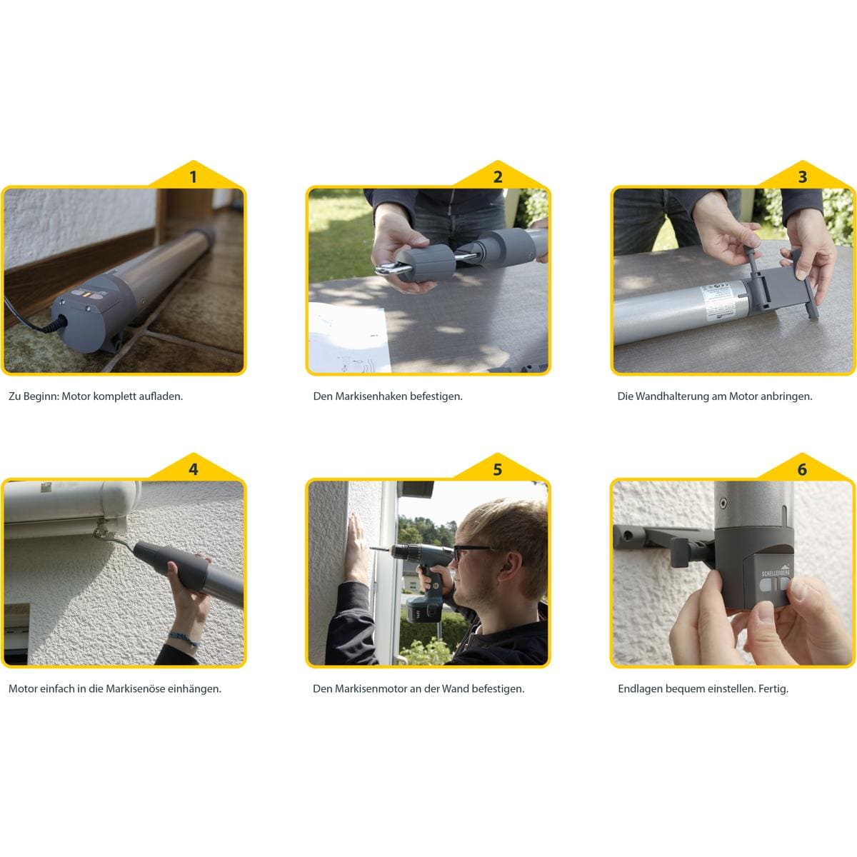 Große Umbaumaßnahmen sind für die Nachrüstung nicht nötig, denn der Antrieb wird einfach in die vorhandene Kurbelöse eingehängt und an der Wand fixiert. Der integrierte Akku treibt die elektrische Markisenkurbel kabellos an und wird mit dem mitgelieferten Ladegerät aufgeladen. Zur Ladeunterstützung können Sie das ebenfalls enthaltene Solarpanel verwenden. Je nach Energiegewinnung bzw. Nutzungsweise kann die Akkuleistung dann variieren.