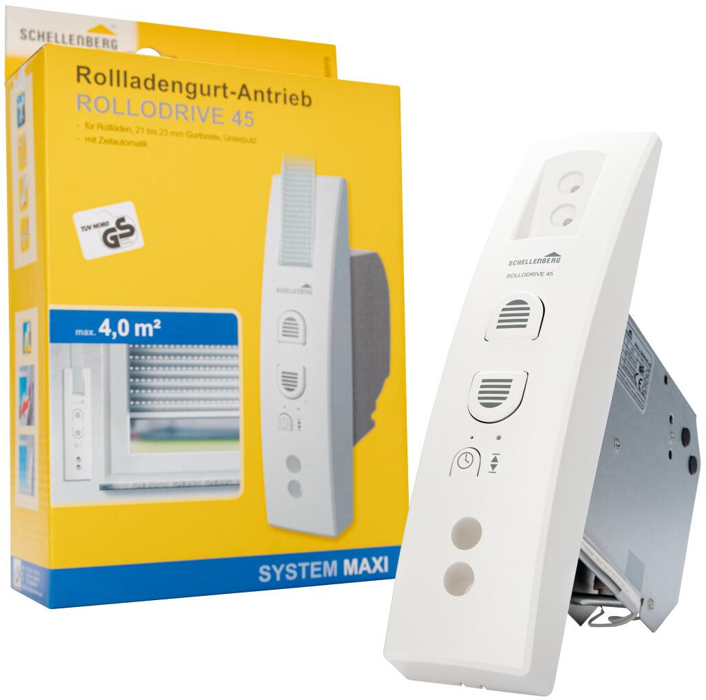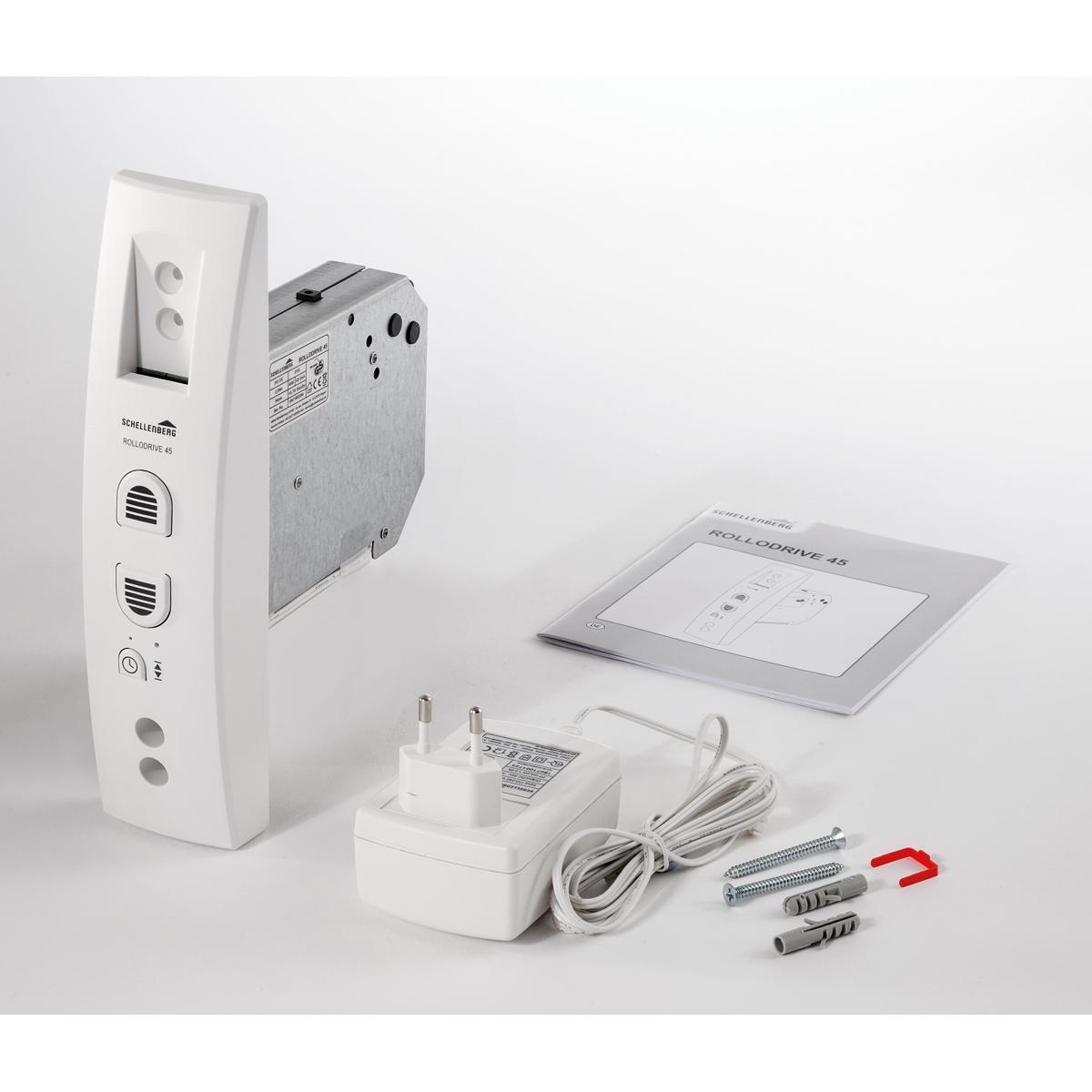 Der Schellenberg RolloDrive 45 ermöglicht die Bedienung eines Rollladens bequem per Knopfdruck oder Zeitautomatik. Der elektrische Gurtwickler ist für Kunststoff-Rolläden bis zu einer Fläche von 4 m² geeignet und kompatibel mit dem Rollladensystem Maxi mit einer Gurtbreite von 23 mm. Er ersetzt einen vorhandenen mechanischen Gurtwickler vollständig. Der RolloDrive 45 kann in alle gängigen Mauerkästen mit einer Öffnungsbreite von mindestens 35 mm und einer Höhe von mindestens 103 mm verbaut werden. Er hat zwei Lochabstände von 135 mm bzw. 165 mm. Der elektrische Gurtwickler ist ideal für Mietobjekte geeignet, da für den Einbau das Öffnen des Rollladenkastens nicht notwendig ist.