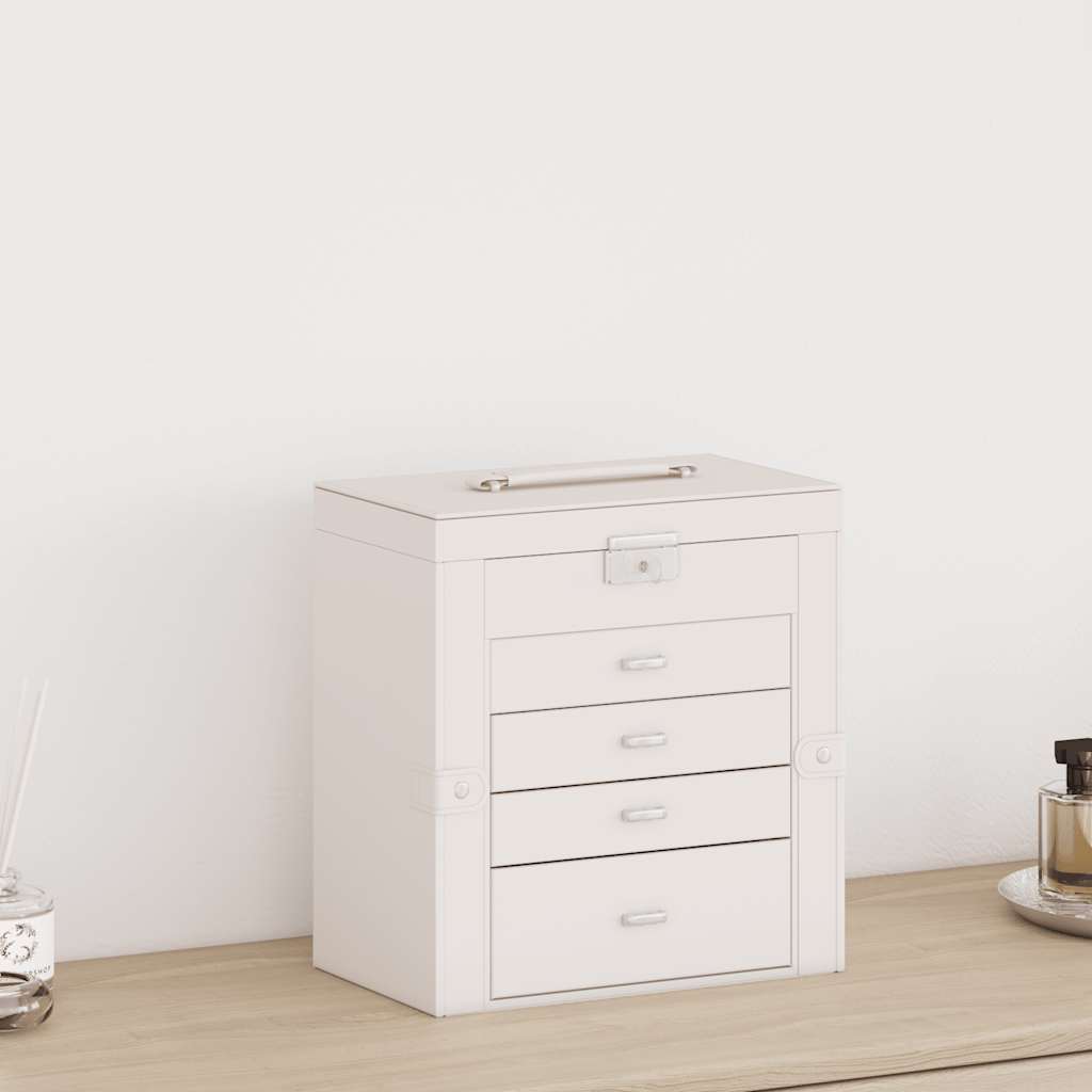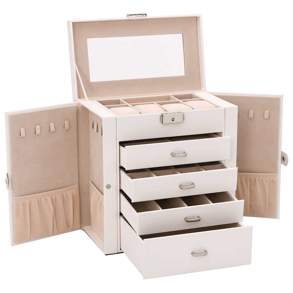 Organisiere deine Schmuckkollektion ganz einfach mit dem 5-schichtigen Schmuckkästchen, das Eleganz und Praktikabilität vereint. Reichlich Stauraum: Der Schmuckkasten verfügt über fünf Schichten mit mehreren Fächern für eine mühelose Organisation. Die oberste bis zur zweiten Schicht enthält spezielle Ringhalter und Fächer für Armbänder und Ohrringe. Seitenteile mit Haken und Taschen ermöglichen dir einen einfachen Zugriff auf Ohrstecker und Halsketten, sodass deine Schmuckkollektion ordentlich und jederzeit griffbereit bleibt.Weiches Samtfutter: Das Innere der Schmuckschatulle ist mit Samt ausgekleidet, der eine weiche, elegante Note vermittelt. Dieses zarte Futter schützt deinen wertvollen Schmuck nicht nur vor Kratzern, sondern hebt auch die gesamte Ästhetik hervor und schafft einen eleganten Raum für deine wertvollen Stücke.Praktisches Design: Der eingebaute Spiegel bietet dir zusätzlichen Komfort beim Schminken oder Überprüfen deines Aussehens, während ein Stoffband den Deckel mit dem Kasten verbindet und ein reibungsloses Öffnen und Schließen gewährleistet. Außerdem ermöglicht dir der herausnehmbare Trenner in der oberen Schicht, den Stauraum individuell an deinen Schmuck anzupassen.Sichere Aufbewahrung: Diese Schmuckschatulle verfügt über eine abschließbare obere Schicht, die zusätzliche Sicherheit für kostbare Stücke bietet. Ausgestattet mit passenden Schlüsseln sind die Wertsachen sicher aufbewahrt und geschützt.Vielseitig einsetzbar: Dieser Schmuckkasten ist ideal für den persönlichen Gebrauch oder als durchdachtes Geschenk. Er passt zu verschiedenen Stilen und Anlässen und spricht sowohl Gelegenheits- als auch anspruchsvolle Schmuckliebhaber an. Gut zu wissen:Nur die oberste Schicht ist abschließbar.