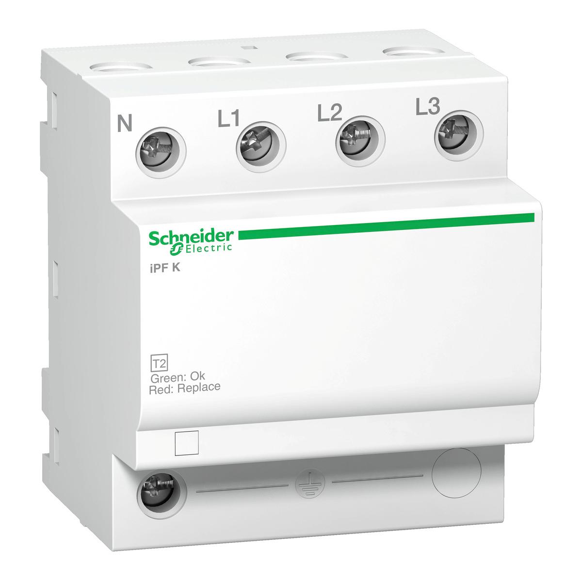 Überspannungsableiter iPF K 40. 3-polig + N. Imax 40kA, In 15kA, Netzform TT&TN-S, Überspannungsschutzpegel kV: ?1,5, Betriebsspannung 400 V AC ±10 %. Breite 4 TE. Frontseitige farbliche Fehlermeldeanzeige, Grün nicht ausgelöst, Rot ausgelöst. Norm IEC 61643-11: 2011 T2.