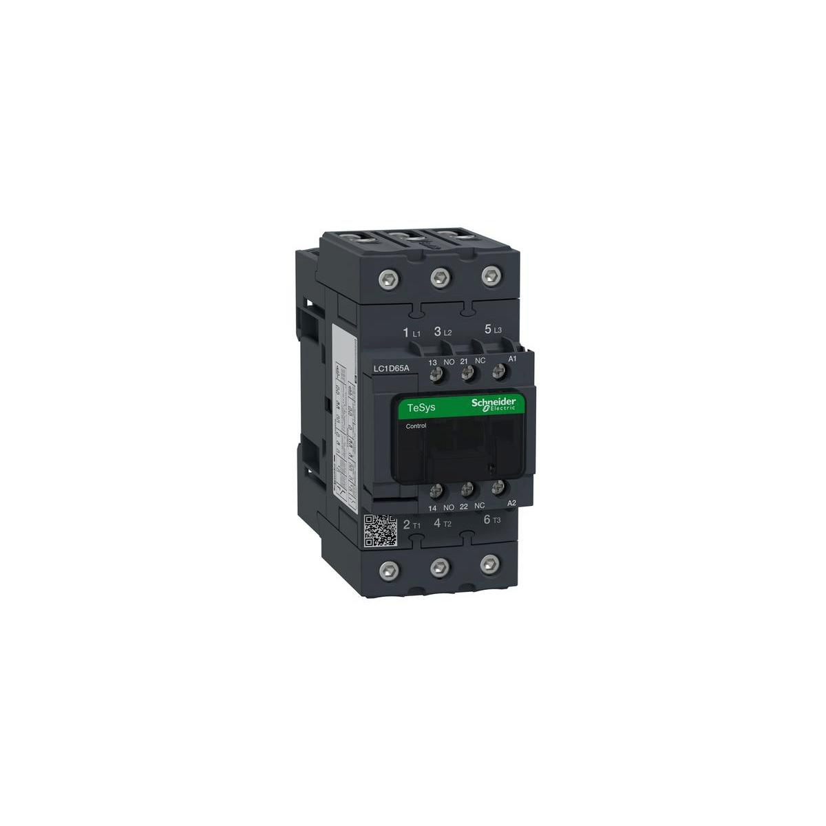 Leistungsschütz TeSys LC1D. 3 polig, 3 Schließer. Zusätzliche Hilfskontakte- 1 Schließer + 1 Öffner, Bemessungsbetriebsleistung bei AC-3, 400 V 30 kW, Bemessungsbetriebsstrom Ie bei AC-3, 400 V 65 A, Spule 230 V AC. Abmessung (BxHxT) 55x122x120 mm, Gewicht 0,86 kg. Kategorie AC-3, AC-1, AC-4. ohne integriertes Beschaltungsmodul. Schnelle und einfache Einrichtung. Sichere und langlebige Stromverbindung mit Everlink und Federklemmen. Geeignet für Sicherheitsanwendungen durch mechanisch gekoppelte Kontakte und Spiegelkontakte. Zertifizierungen nach UL, GOST, CSA, CCC. Produktstandards gem.