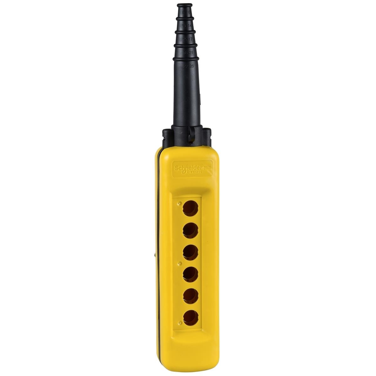 XAC A Leergehäuse. 6 vertikale Bohrungen. Befehlsstellen 6. Lieferumfang Gehäuse, Innenplatine, Kabelknickschutzhülle. Kabelzugentlastung, Spannband für Knickschutzhülle, Ringöse.