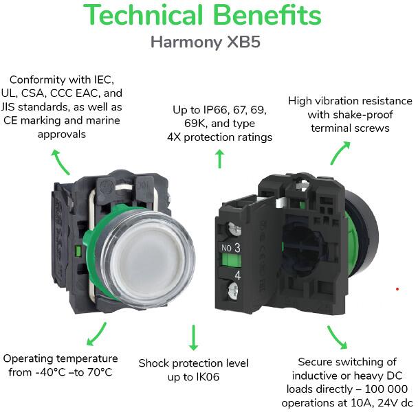Die Baureihe Harmony XB5/ZB5 aus Kunststoff bietet eine Vielzahl an 22mm Komplettgeräten wie Drucktaster, Leuchtmelder und Wahlschalter bis hin zum Not-Aus-Schalter. Zusätzlich ist es durch den modularen Aufbau der Geräte möglich, alle Bestandteile auch als Einzelelemente zu beziehen sowie wahlweise auch für 30mm Einbaumaß. Aufgrund der Qualität, der Flexibilität und der extremen Robustheit (Schutzklassen bis IP69K) eignen sich die Geräte ideal für die meisten Anwendungen in der Industrie und in Gebäuden. Dieser Leuchtwahlschalter in der Farbe orange ist kompatibel mit einer universellen LED mit verschiedenen Versorgungsspannungen. Dieses Frontelement verfügt über 2 Stellungen. Die Montage dieses Produkts erfolgt in einer 22mm Bohrung. Aufgrund der Vielzahl von vorhandenen Produktstandards und Zertifizierungen geeignet für den internationalen Einsatz. Dank des Green Premium Umweltzeichens können Sie detaillierte Informationen zu Materialinhalten, Umweltauswirkungen und Kreislaufwirtschaft erhalten, die Ihre Nachhaltigkeitsziele unterstützen.