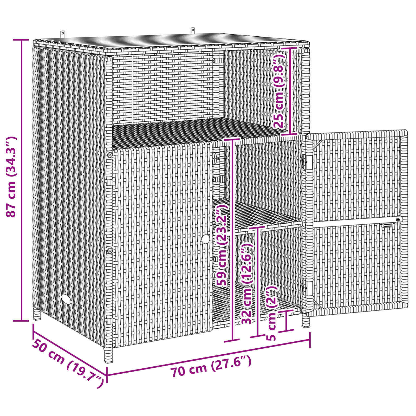 Dieser schicke Rattan-Schrank mit Holzoberfläche bringt modernen Flair in dein Zuhause, drinnen und draußen. Er wurde so gestaltet, dass er perfekt in jeden Garten oder jede Terrasse passt. Mit klaren Linien und durchdachtem Design strahlt er Einfachheit und Stil aus. Die Mischung aus Materialien und Farben macht ihn zu einer vielseitigen Ergänzung für viele Einrichtungsstile und ist die ideale Lösung für Hausbesitzer, die nach praktischen und schicken Möbeln suchen. Massivholz Akazie: Der Schrank hat eine robuste Oberfläche aus massivem Akazienholz, bekannt für seine Stärke und Wetterbeständigkeit. Die natürlichen Holzfarben sorgen für Wärme und Charakter und passen perfekt zu dem modernen Design. Pulverbeschichteter Stahlrahmen: Der stabile pulverbeschichtete Stahlrahmen sorgt für Langlebigkeit. Die geölte Oberfläche erhöht die Ästhetik und schützt vor Feuchtigkeit. Poly-Rattan-Elemente: Regale und Türen aus Poly-Rattan bieten eine coole Kombination aus Textur und Widerstandsfähigkeit, ideal für drinnen und draußen. Geräumiges Design: Mit viel Stauraum kann der Schrank verschiedene Sachen wie Gartenwerkzeuge oder Haushaltsartikel unterbringen. So bleibt alles schön ordentlich. Pflegehinweise: Damit der Schrank lange schön bleibt, gelegentlich mit einem weichen, feuchten Tuch reinigen. Scharfe Chemikalien vermeiden, um die Oberfläche zu schonen.