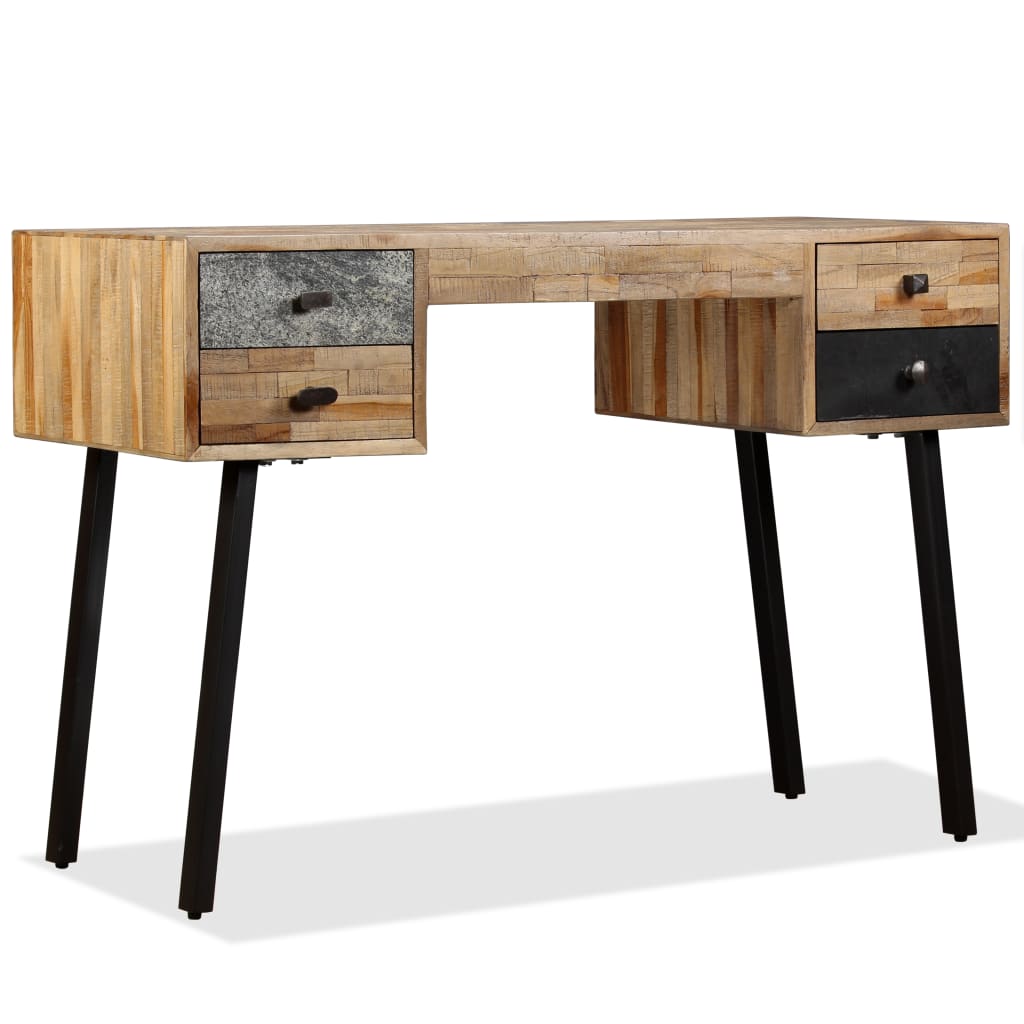 Dieser Schreibtisch im Vintage-Stil ist ein zeitloses Zubehör für Ihr Arbeitszimmer, Büro oder Wohnzimmer. Der Schreibtisch ist aus massivem Teak gefertigt; dadurch ist er solide, stabil, langlebig und schön. Sie können verschiedene Gegenstände wie Bücher, Notizblöcke, Stifte und andere Kleinigkeiten in seinen vier geräumigen Schubladen aufbewahren. Die marmorierte Schubladenoberfläche verleiht dem Schreibtisch einen einzigartigen Retro-Look. Jeder Schritt des Produktionsverfahrens, sei es Neukombinieren, Polieren und Lackieren, ist mit großer Sorgfalt durchgeführt worden. Wichtiger Hinweis: Die Farben und Maserungen des Holzes sind von Produkt zu Produkt unterschiedlich, so dass jeder Schreibtisch einzigartig - ein Unikat ist; die Lieferung erfolgt nach dem Zufallsprinzip.