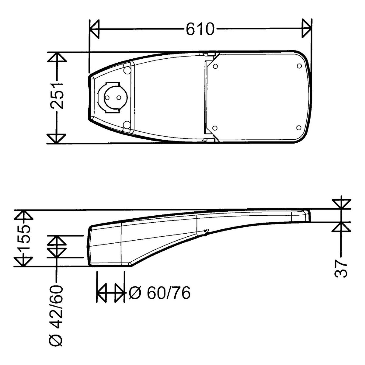 LED-Außenleuchte mit variabel einstellbarem Lichtstrom, bestehend aus zweiteiligem, pulverlackiertem Aluminiumdruckgussgehäuse. Oberteil mit EVG, LED-Modulen, Optiken, Schalter zum Einstellen des Lichtstroms und rahmenlosem, flachem Sicherheitsglas, vom Unterteil aufklapp- und abnehmbar. Unterteil mit integriertem Mastbefestigungssystem, Neigungsverstellung, Kabeleinführung, Trennsteckverbindung, Zugentlastung und Druckausgleichssystem mit interner Entlüftung in den Mastanschlussraum (verschmutzungssicher). Zhaga-konforme LED-Module mit hocheffizienten Optiken, direkt strahlend, Multi-Layer Technologie. EVG mit hoher Stoßspannungsfestigkeit, Überlast- und Kurzschlussschutz. Universal-Mastbefestigungssystem aus Aluminiumdruckguss für Mastaufsatz Ø 60/76mm und Mastansatz Ø 42/60mm.