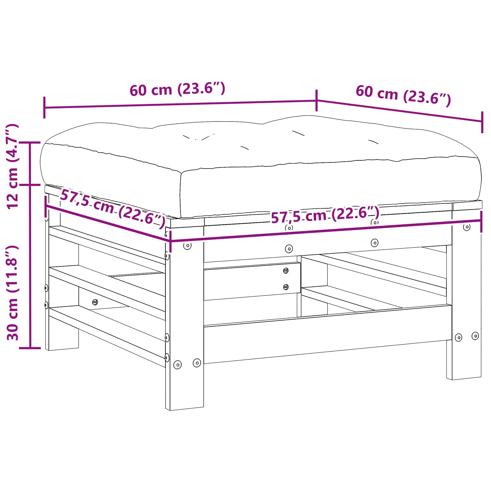 - Gesamtabmessungen: 57,5 x 57,5 x 30 cm (L x B x H)