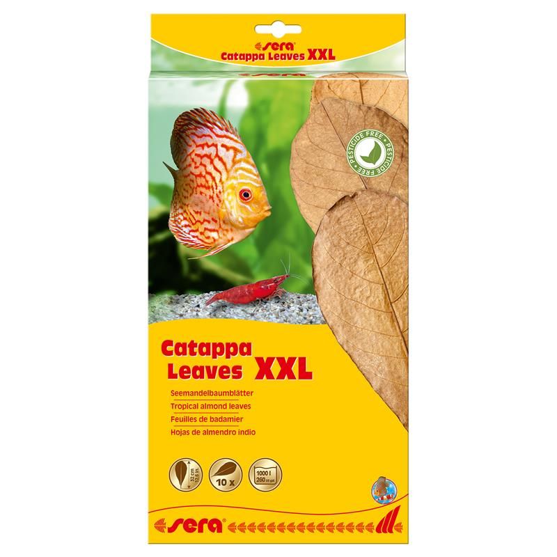 Mit den sera Catappa Leaves XXL kann das Wasser wie in natürlichen Biotopen aufbereitet werdenDie Seemandelbaumblätter fördern das natürliche Verhalten sowie die Laichbereitschaft von Zierfischen und Garnelen. Außerdem beugen sie bakteriellen Infektionen und Verpilzungen vor. Dank ihrer adstringierenden Eigenschaften unterstützen sie den Heilungsprozess bei Verletzungen. Garnelen, Krebse und Welse nehmen die Seemandelbaumblätter gerne als zusätzliche Nahrung an. Anwendung: Ein Blatt für 100 l Aquarienwasser in das Becken geben. Die Blätter sinken innerhalb von 24 - 48 Stunden. Tipp: Durch vorheriges Überbrühen sinken sie umgehend und können besser verdaut werden. Die Wirkstoffe werden über 2 - 3 Wochen abgegeben. Naturprodukt mit möglichen Abweichungen in Form, Farbe und Größe.Inverkehrbringer: sera GmbH, Borsigstr. 49, 52525 Heinsberg, Tel.: 02452/91260, E-Mail: info@sera.de