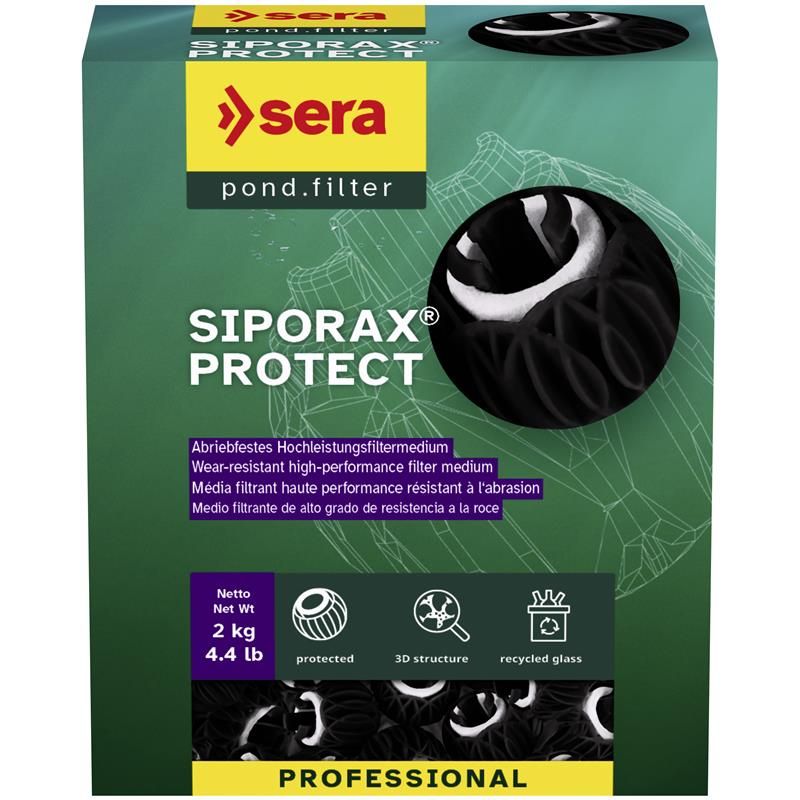 Abriebfestes Hochleistungsfiltermedium- abriebfestes, biologisches Hochleistungsfiltermedium- Protect Ball verbessert die Anströmung und optimiert die biologische Filterleistung- bietet nützlichen Filterbakterien eine maximale Siedlungsfläche- erhöht die Reinigungskapazität und Standzeit des Filters- anwendbar in Druck-, Durchlauffiltern und Moving Bed FilternDer Abbau von Fischausscheidungen und organischen Abfällen im Ökosystem Gartenteich ist von großer Bedeutung. Fisch- und Koiteiche stehen hierbei besonders im Fokus, da der teilweise hohe Besatz zu einer starken Wasserbelastung führt.Im sogenannten Stickstoffkreislauf werden die Giftstoffe Ammoniak und Nitrit durch Reinigungsbakterien zum ungiftigen Pflanzennährstoff Nitrat verstoffwechselt. Voraussetzung für einen effizienten Stickstoffkreislauf ist eine ausreichend dimensionierte Ansiedlungsfläche für Reinigungsbakterien.In Filtern mit starker Durchströmung oder bewegten Filtermedien (Moving Bed Filter) sind die Herausforderungen an den Schutz vor mechanischer Zerstörung und Abrieb besonders hoch.Pond Siporax Protect ist eine gezielte Entwicklung zum Schutz des bewährten Pond Siporax Original. Damit sind dem beliebten Hochleistungsfiltermedium keine Grenzen mehr hinsichtlich seiner Verwendbarkeit gesetzt. Die robusten Protect Balls schützen die innenliegenden Pond Siporax Original Ringe vor Abrieb und Bruch; die strukturierte Oberfläche zur Ansiedlung von (de-)nitrifizierenden Filterbakterien bleibt erhalten.Durch die einzigartige Form und den Aufbau des äußeren Protect Balls wird die Anströmung verbessert und der Wasserdurchfluss optimiert, sodass der Siporax-Ring noch effektiver durchströmt wird.Die spezielle offenporige und dreidimensionale Tunnelstruktur des Pond Siporax Original bietet bei gleichem Filtervolumen eine um ein Vielfaches größere Siedlungsfläche verglichen mit anderen Filtermedien. Die miteinander verbundenen Poren aus recyceltem Sinterglas sorgen für eine permanente Wasserzirkulation innerhalb des Filtermaterials. Durch diese Art der biologischen Selbstreinigung wird die Standzeit des Filters bis zur nächsten Reinigung erheblich verlängert.Inverkehrbringer: sera GmbH, Borsigstr. 49, 52525 Heinsberg, Tel.: 02452/91260, E-Mail: info@sera.de