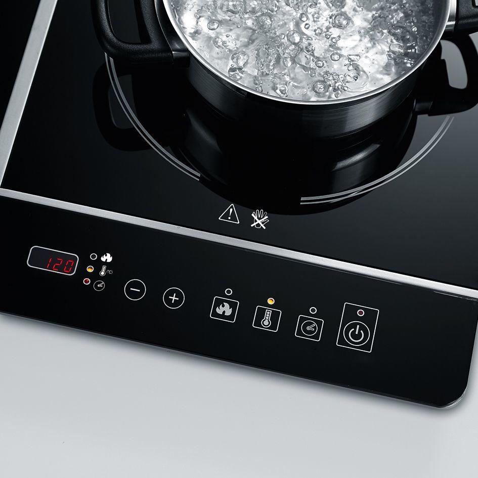 Doppelt hält besser: Die zwei Glaskeramik-Kochplatten mit Induktion und automatischer Topferkennung können auf Temperaturen bis zu 240 °C oder in zehn Leistungsstufen erhitzt werden. Durch schnelle Wärmezufuhr gibt es nur minimalen Energieverlust, die Hitze entsteht direkt im Topfboden, Anbrennen auf dem Kochfeld ist nicht mehr möglich.