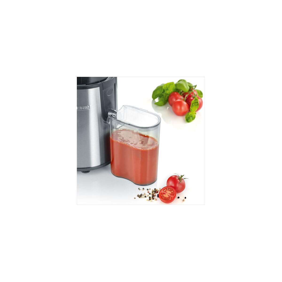 - Saftauffangbehälter aus BPA-freiem Kunststoff mit einer Kapazität von ca. 500 ml, inkl. Deckel zur Schaumtrennung