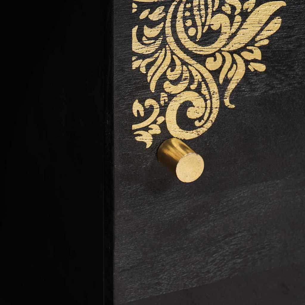 Dieses elegante Sideboard verbindet Stil und Funktionalität auf perfekte Weise und ist eine moderne Aufbewahrungslösung für jeden Raum. Mit seinem beeindruckenden rechteckigen Design aus massivem Mango-Holz fügt es sich perfekt in Esszimmer oder Wohnbereiche ein. Die auffälligen goldenen Details und Messingelemente verleihen einen Hauch von Luxus, der den zeitgenössischen Look perfekt ergänzt. Ob als Hingucker oder harmonisch in bestehende Einrichtungsstile, dieses Sideboard erfüllt die Erwartungen designaffiner Hausbesitzer. Materialien: Das Sideboard kombiniert massives Mango-Holz mit Holzwerkstoffen und bietet eine stabile und schicke Struktur. Die Materialwahl sorgt für Langlebigkeit, während die natürlichen Holzfarben warme Akzente setzen ? ein Beispiel für Schönheit und praktische Haltbarkeit. Enthaltene Komponenten: Jeder Griff und jedes Bein aus Messing sorgt für einen luxuriösen Look, der sowohl Stil als auch Funktionalität erhöht. Das stabile Pfostenbeindesign macht das Sideboard zur tollen Ergänzung in jedem Zuhause und trägt problemlos schwere Deko oder Essutensilien. Eigenschaften / Funktion / Design: Geschmückt mit goldbedruckten Designs, ist das Sideboard sowohl dekorativ als auch funktional. Die Türen mit Scharnieren und Messingknöpfen öffnen sich und bieten viel Stauraum für Gegenstände aller Formen und Größen in seinen variablen Fächern. Raumdekor-Kompatibilität: Perfekt für Wohnzimmer, passt dieses Aufbewahrungselement sich verschiedenen Stilrichtungen an ? von minimalistisch bis eklektisch ? und bietet platzsparende Lösungen, ohne den Style zu verlieren. Pflege & Wartung: Die Oberfläche des Sideboards ist super pflegeleicht ? einfach mit einem trockenen Tuch abwischen, um den glanzvollen Look zu erhalten. Diese einfache Pflege sorgt dafür, dass das Stück weiterhin als Blickfang im Raum strahlt, während es praktische Aufbewahrung bietet.