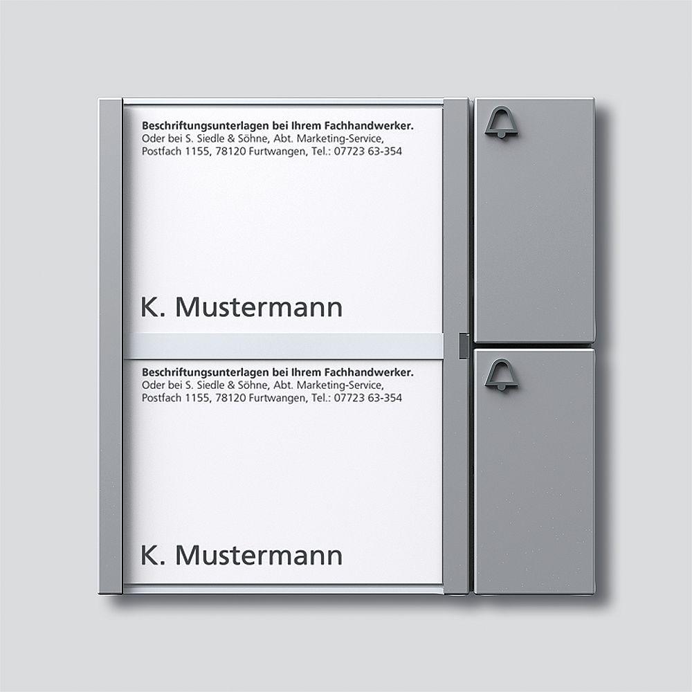 Bus-Tasten-Modul mit Namensschildtasche, 2 Namensschildern und 2 separaten Ruftasten mit Glockensymbol.