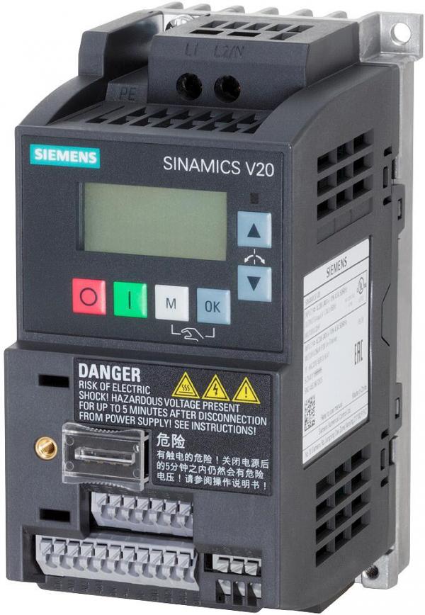 Frequenzumrichter SINAMICS V20. Einfach. Robust. Effizient. Für industrielle Applikationen und gewerbliche Anwendungen im Spannungsbereich 1AC 200 V bis 240 V. SINAMICS V20 zeichnet sich durch kurze Inbetriebnahmezeiten, einfache Bedienung, Robustheit und Kosteneffizienz aus. Der Umrichter kann ohne zusätzliche Module direkt aus der Verpackung betrieben werden. Zur Steigerung der Energieeffizienz ist der Umrichter mit einem energieoptimalen Steuerungsverfahren mit automatischer Flussabsenkung ausgerüstet. Er stellt zudem den aktuellen Energieverbrauch dar und verfügt über weitere integrierte Energiesparfunktionen. Der Keep-Running-Modus ermöglicht einen stabilen Betrieb auch bei schwierigen und schwankenden Netzbedingungen. Der SINAMICS V20 kann mittels verschiedener Optionen, wie lokale Bedieneinheit Basic Operator Panel (BOP) oder mobile Bedieneinheit SINAMICS V20 Smart Access Module, BOP-Interface, Standard-Netzwerkkabel, Netzfilter, Bremswiderstände, Schirmung, etc. individuell den Anforderungen der Applikation angepasst werden. Zudem ermöglicht er die einfache Systemkonfiguration mit vordefinierten Makros im Umrichter und vorgefertigten Funktionsblöcken aus dem Totally Integrated Automation Portal (TIA-Portal) für den schnellen Anschluss z.B. an eine SIMATIC-S7-1200 Steuerung. Der Basisumrichter SINAMICS V20 ist eine technische und wirtschaftliche Alternative für den Micromaster 420 Frequenzumrichter. SINAMICS - einfach mein Antrieb.