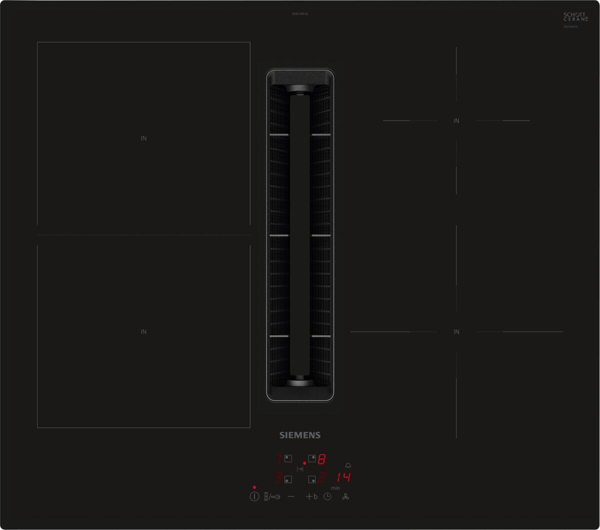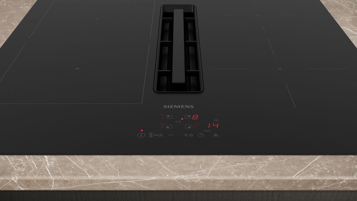 - Induktionskochfeld mit vollintegriertem, leistungsstarkem Downdraft-Abzugsmodul.
