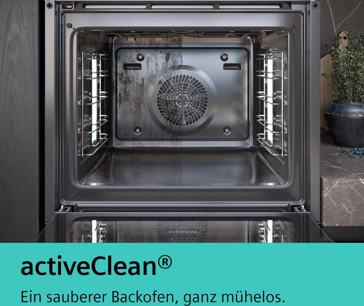 Dank activeClean® reinigt sich dein Backofen selbst. Entferne einfach den groben Schmutz, den Rest erledigt der Backofen. Auf Knopfdruck werden alle Reste vom Backen, Braten und Grillen bei hoher Temperatur in Asche verwandelt. Du musst dann nur noch mit einem feuchten Tuch nachwischen ? und fertig.