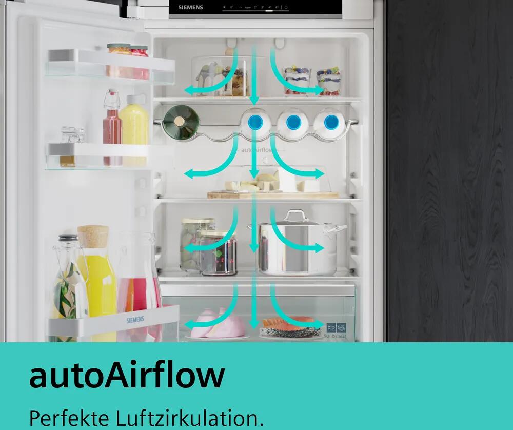 Möchtest du Lebensmittel auf allen Ebenen deines Kühlschranks länger frisch halten? Das geht mit autoAirflow ganz einfach: Das System zirkuliert die Luft im Kühlschrank gleichmäßig und sorgt damit für eine konstante Temperatur auf allen Ebenen. Lebensmittel kühlen so schneller herunter und bleiben länger lecker und frisch.