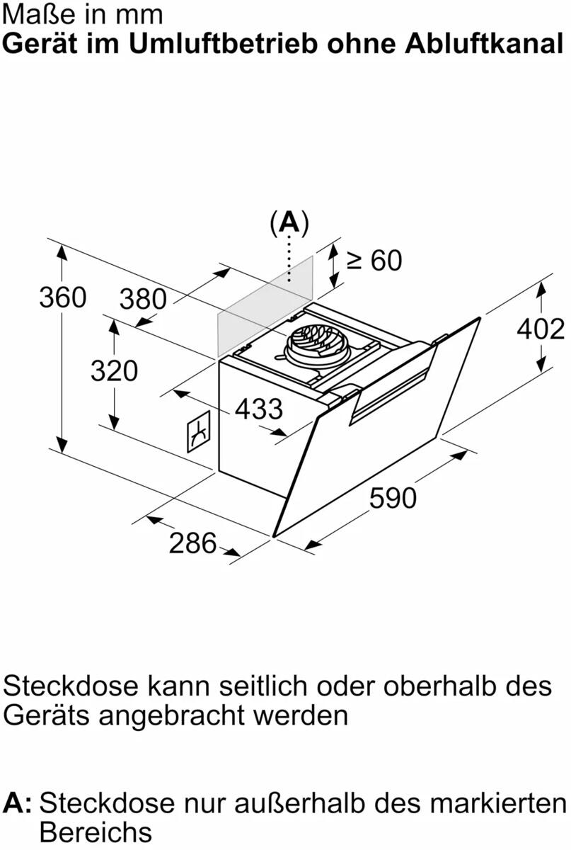 - Maße Umluftbetrieb, kaminlos (HxBxT): 360 mm x 590 mm x 433 mm