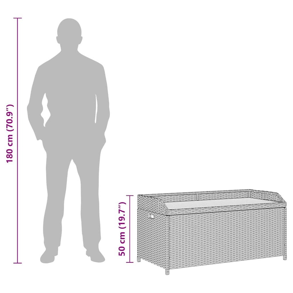 Suchen Sie eine attraktive und vielseitige Aufbewahrungslösung für den Außenbereich? Dann ist diese Sitzbank mit Stauraum aus Poly-Rattan die ideale Wahl für Sie! Sie ist mit einem geräumigen Stauraum ausgestattet und bietet Platz für Gartenartikel, Gartenmöbel-Kissen, Auflagen, Plaids, Pool- und Gartenbedarf. Diese Garten-Sitzbank besteht aus Poly-Rattan, Akazienholzlatten und Stahlrahmen, was Langlebigkeit und Wetterbeständigkeit sowie jahrelangen, zuverlässigen Dienst gewährleistet. Die Bank verfügt über eine Innentasche, die den Inhalt vor Staub und Feuchtigkeit schützt. Dank der erhöhten Füße sorgt diese Gartenbank für eine gute Luftzirkulation und hält den Inhalt trocken und sauber. Zudem ist sie leicht mit einem feuchten Tuch sauber zu halten. Die Garten-Aufbewahrungsbank ist einfach zu montieren. Hinweis: Bitte decken Sie die Auflagenbox mit wasserdichtem Stoff/Material ab, damit bei Regen kein Wasser in die Box eindringt.