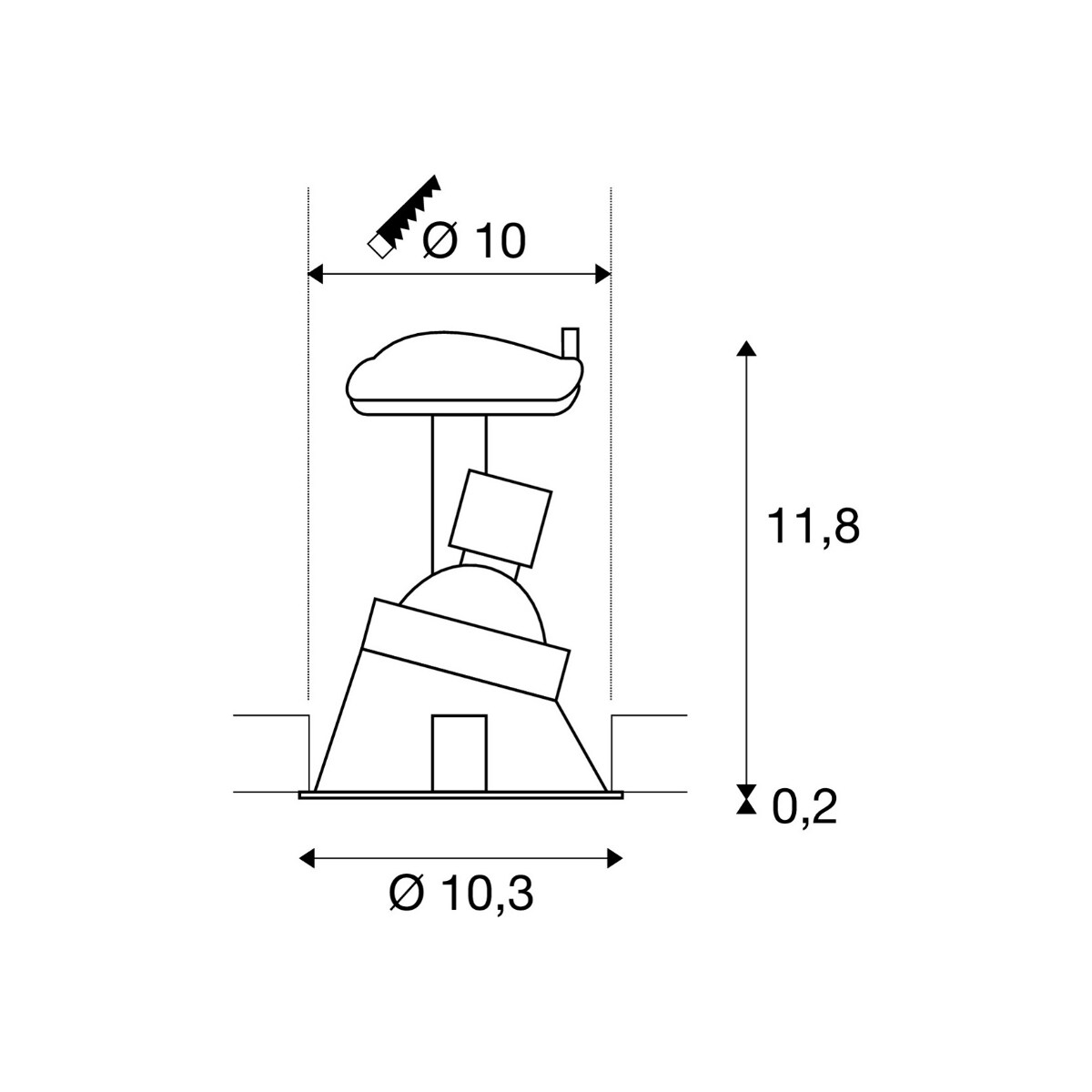 Starre Hochvolt Einbauleuchte der HORN Serie. Bei der aus Stahl gefertigten Leuchte ist das Leuchtmittel schräg nach hinten versetzt eingebaut durch diese Bauweise ergibt sich eine besondere Optik sowie eine wirksame Blendenreduzierung.