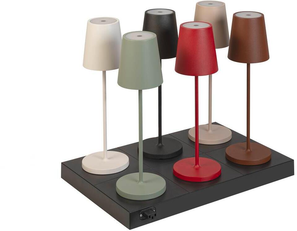 Aufladen lässt sie sich mit dieser Ladebasis, an die bis zu sechs Leuchten anschließbar sind.