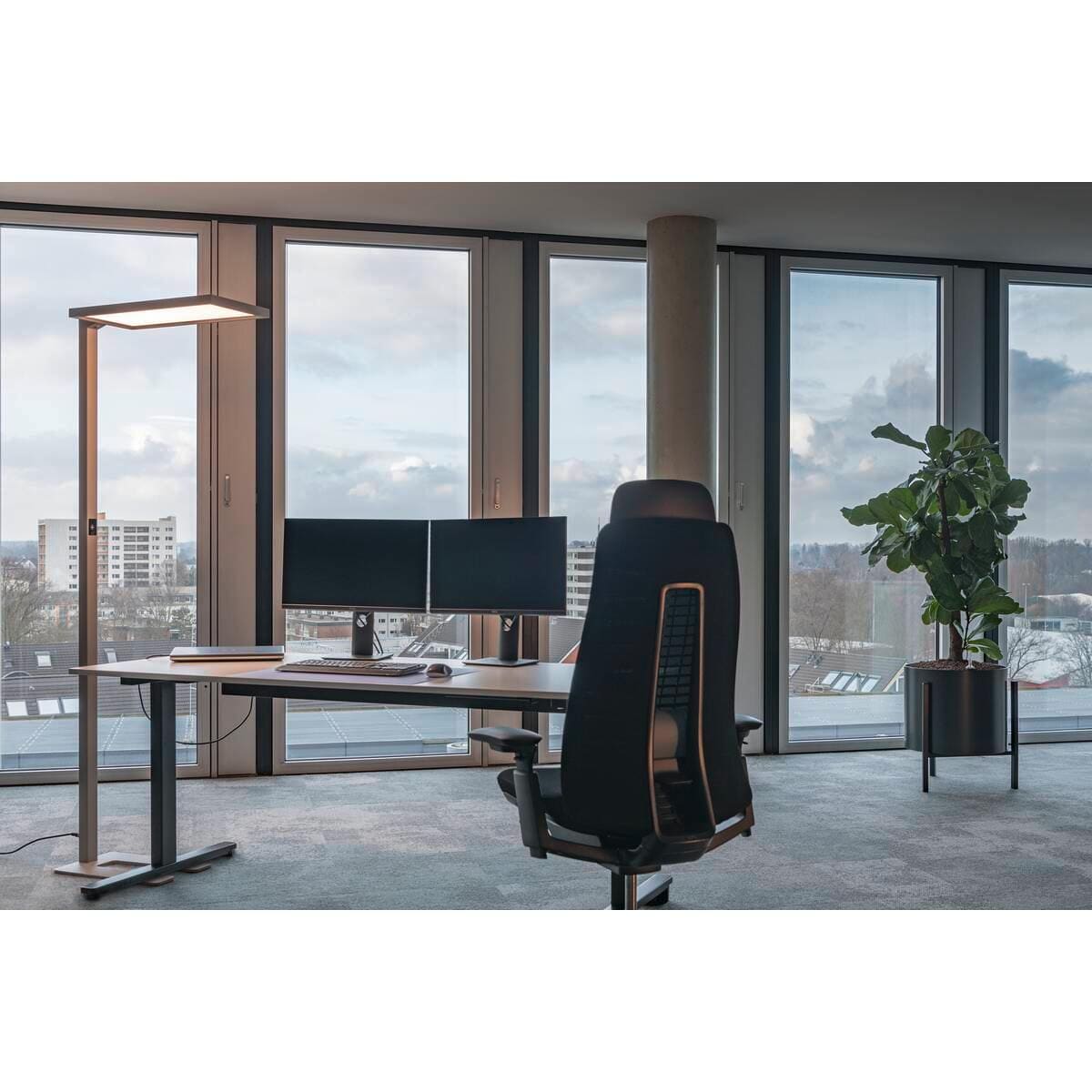 Die silberne WORKLIGHT FL wird allen Anforderungen einer modernen Arbeitsplatzbeleuchtung gerecht. Durch das eingebaute LED-Leuchtmittel, 7600 Lumen, UGR ? 19 und 4000 Kelvin erzeugt die Stehleuchte ein neutralweißes und blendfreies Licht, das die Konzentration fördert. Dazu kommen der Bewegungssensor, die Tageslichtsteuerung sowie stufenlose Dimmbarkeit. Durch den integrierten Treiber sowie der Zuleitung inklusive Stecker, lässt sich die WORKLIGHT FL direkt anschließen. Dazu ist sie mit ihrer LED Lebensdauer von 50000 Stunden auch noch äußerst langlebig.