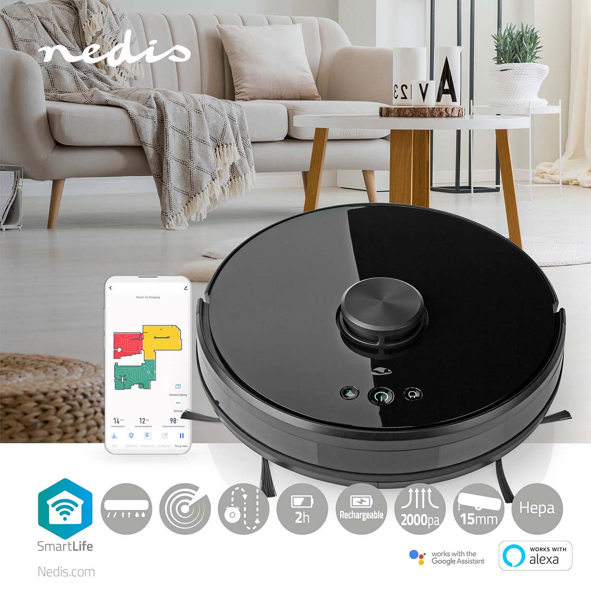 Sie können einen täglichen oder wöchentlichen Reinigungsplan erstellen oder ihn direkt an einen bestimmten Ort in Ihrem Haus senden. Aber durch die Kombination mit anderen intelligenten Produkten in der Nedis SmartLife-App können Sie auch die Automatisierung einstellen, sodass der Staubsauger automatisch mit der Reinigung beginnt, nachdem Sie Ihr Haus verlassen haben, oder nach dem Ausschalten des Lichts in der Nacht.