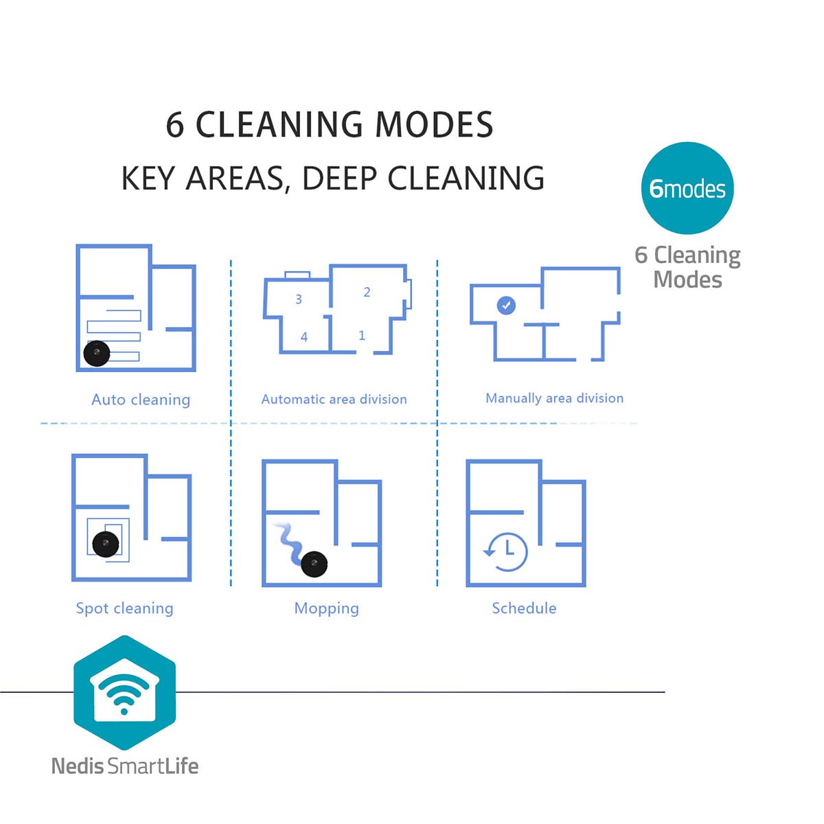Sie können einen täglichen oder wöchentlichen Reinigungsplan erstellen oder ihn direkt an einen bestimmten Ort in Ihrem Haus senden. Aber durch die Kombination mit anderen intelligenten Produkten in der Nedis SmartLife-App können Sie auch die Automatisierung einstellen, sodass der Staubsauger automatisch mit der Reinigung beginnt, nachdem Sie Ihr Haus verlassen haben, oder nach dem Ausschalten des Lichts in der Nacht.